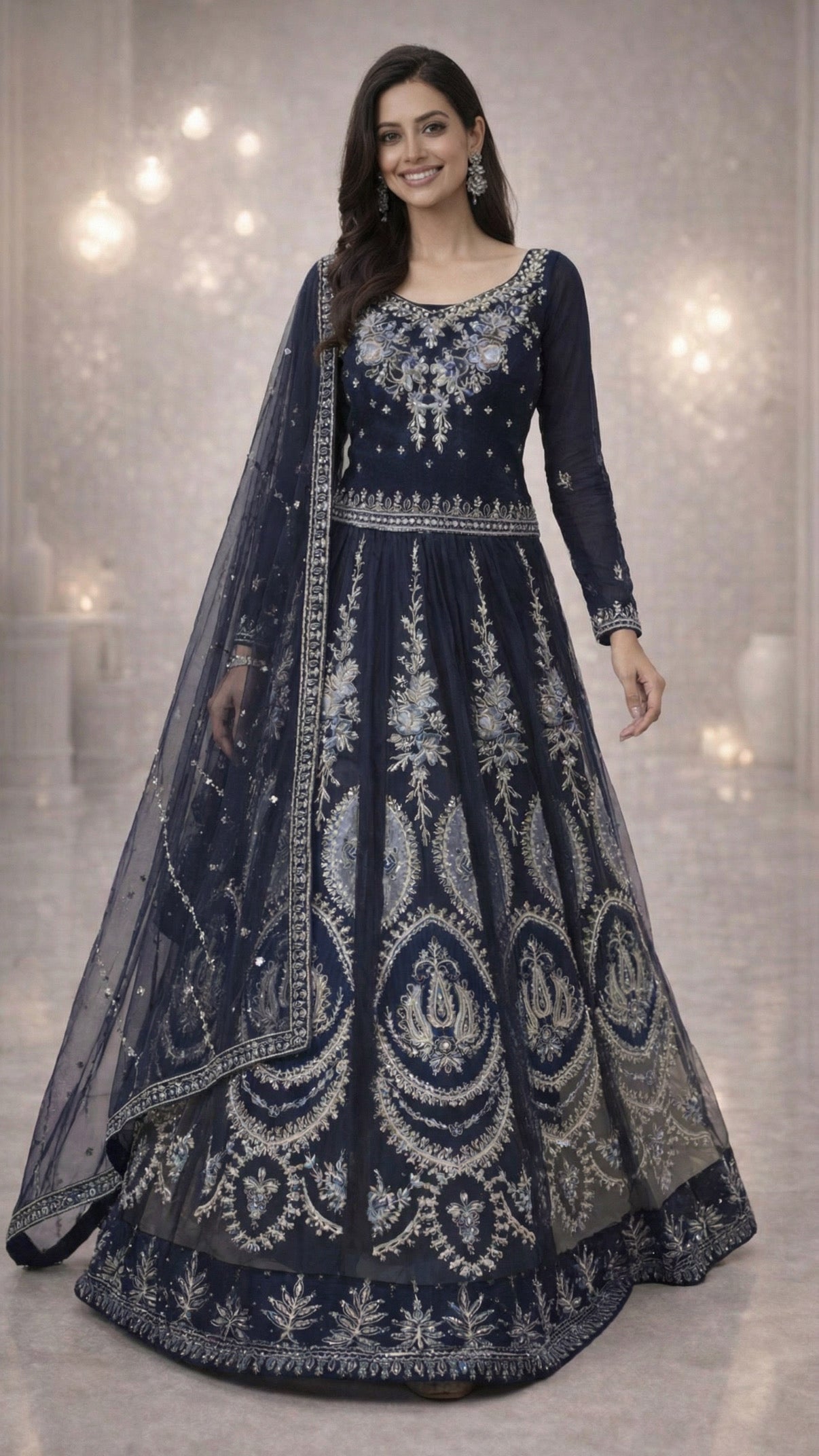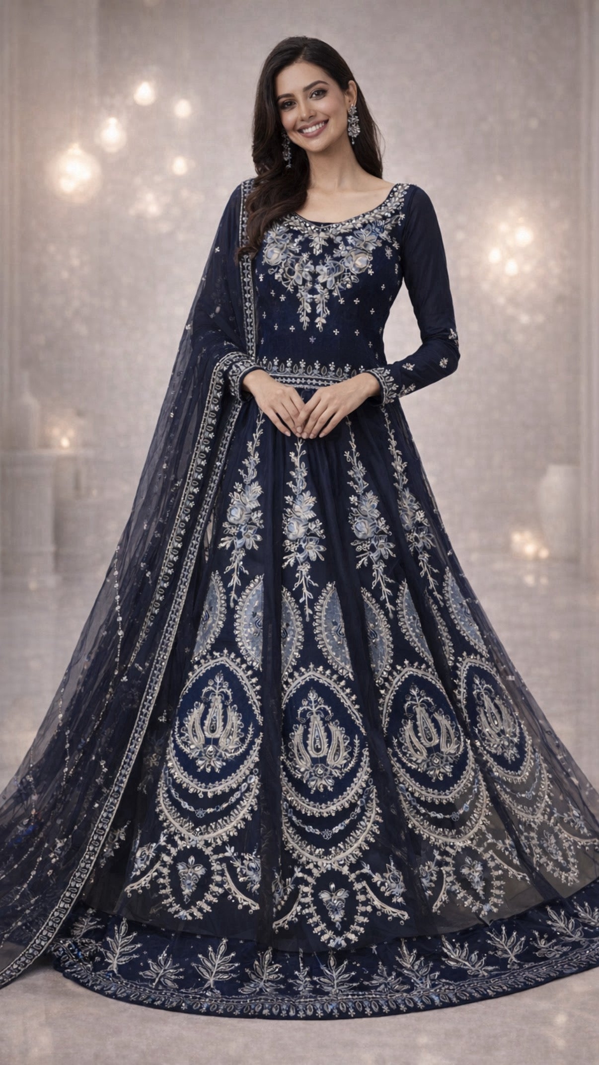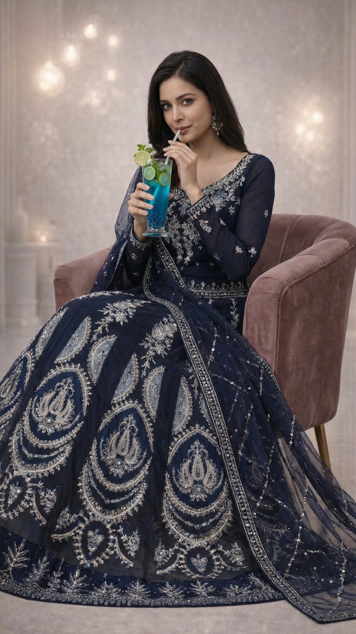𝐃-𝟏 is a blend of luxury and elegance, featuring rich navy blue tones and exquisite hand-embellished details for a standout look.