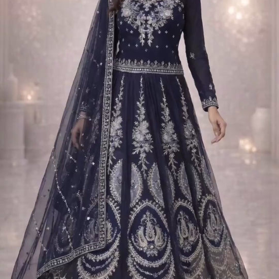𝐃-𝟏 by ESHAAL COLLECTION is a masterpiece from our Luxury Embroidered Wedding Collection, designed to make a statement. This stunning outfit features a rich navy blue palette crafted from premium organza fabric for the maxi dress and dupatta, paired with luxurious Jacquard Banarasi flare trousers. The ensemble is adorned with intricate 3D floral appliqués, delicate hand-embellishments, and exquisite Qaweya cutwork, showcasing exceptional craftsmanship. Perfect for those seeking elegance and sophistication, this unstitched set allows you to tailor the look to your exact fit and style. Please note, the actual colour may vary slightly from the image shown, adding a unique touch to your special occasion attire.