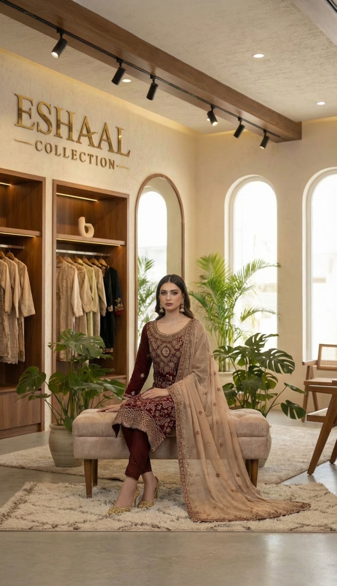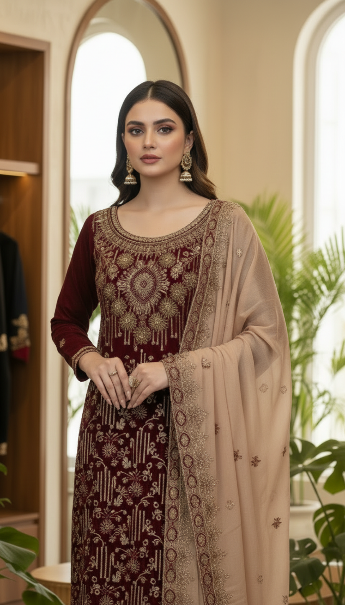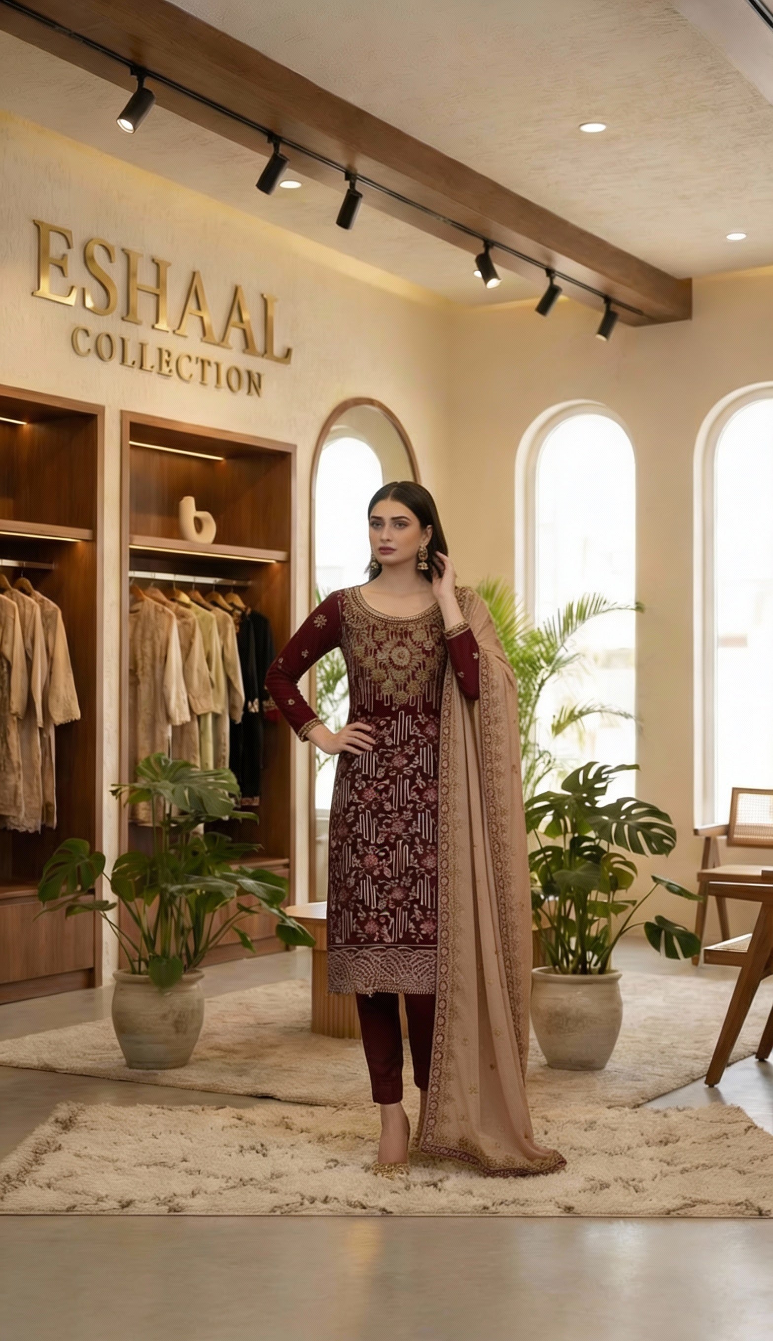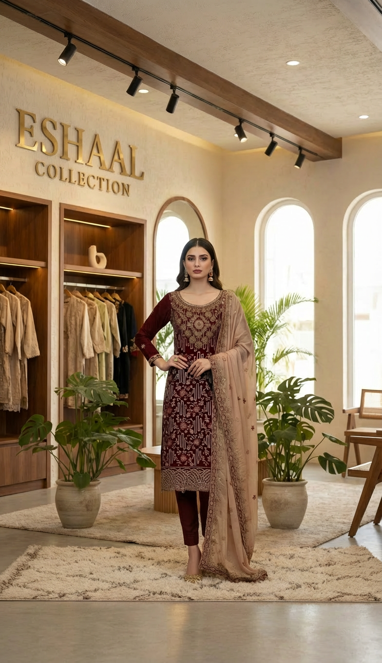 The outfit features a shirt and dupatta made from delicate chiffon fabric, known for its lightweight and flowing drape. The shirt is the centerpiece, adorned with intricate detailing, likely including the star motifs suggested by the name, and other embellishments. The dupatta complements the shirt, possibly with coordinating embroidery or embellishments, enhancing the overall look. The trousers are crafted from Indian Raw Silk, providing a luxurious feel and a tailored fit to complete the ensemble.The outfit is available in several rich,Β Warm Maroon.Β Which provides a unique aesthetic, allowing for versatile styling and suitability for various occasions.