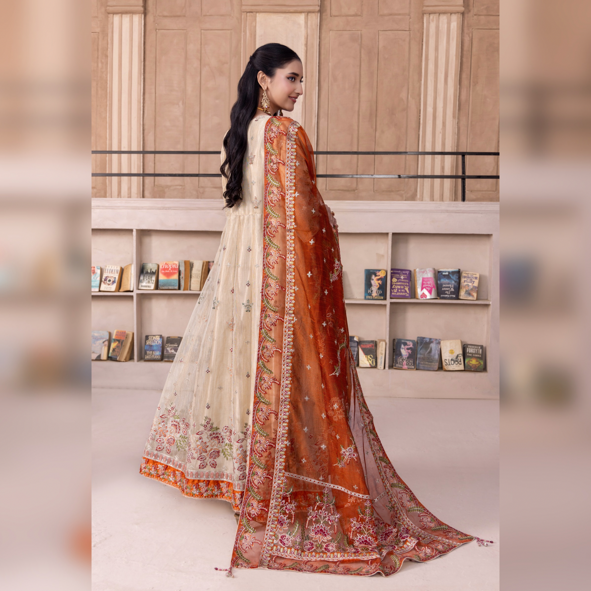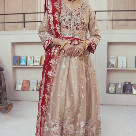 Outfit~ Embroidered 6 kali front & back panels, Embroidered & hand embellished front & plain back body, Embroidered front & back patches on silk, Embroidered sleeves, Embroidered ready to wear dupattaย