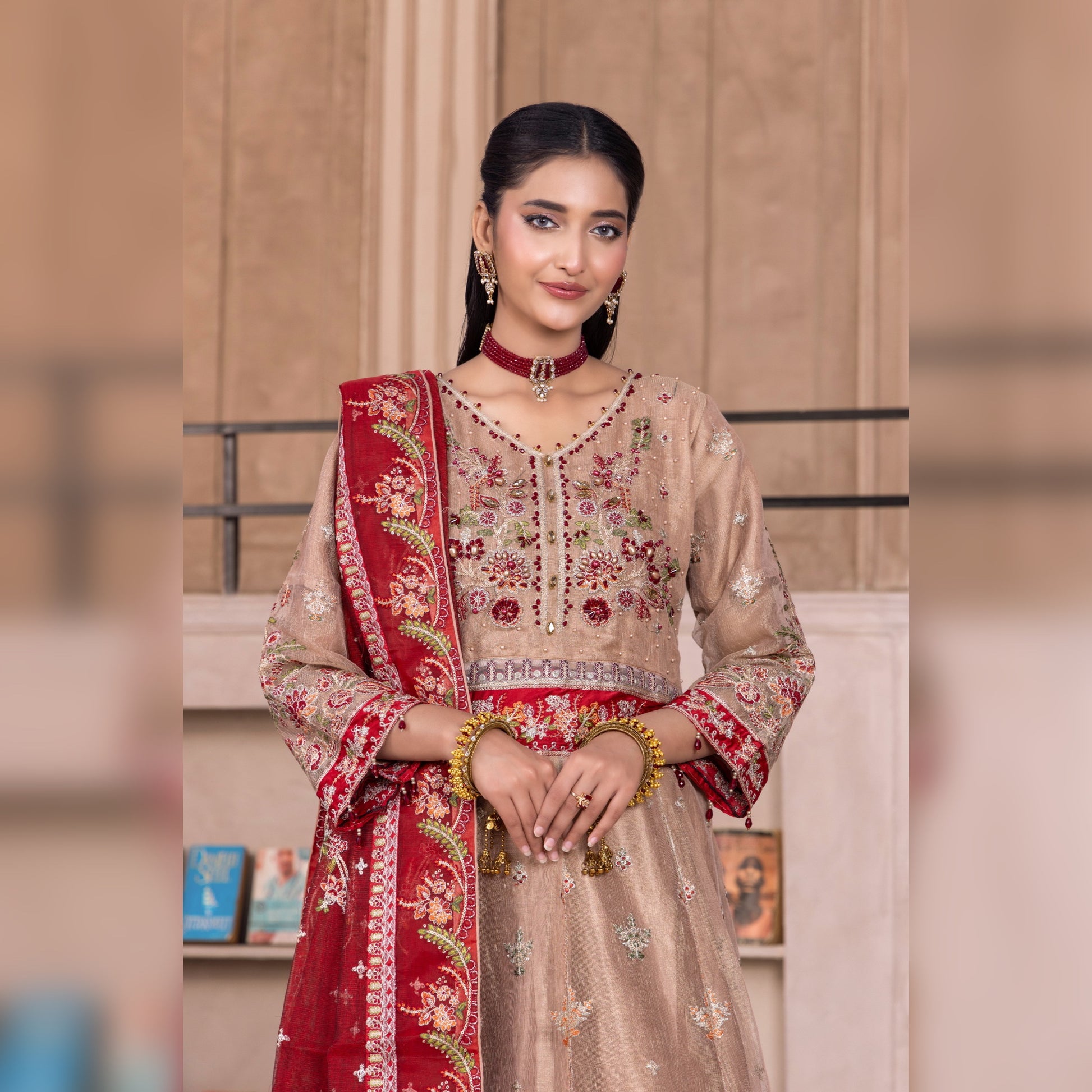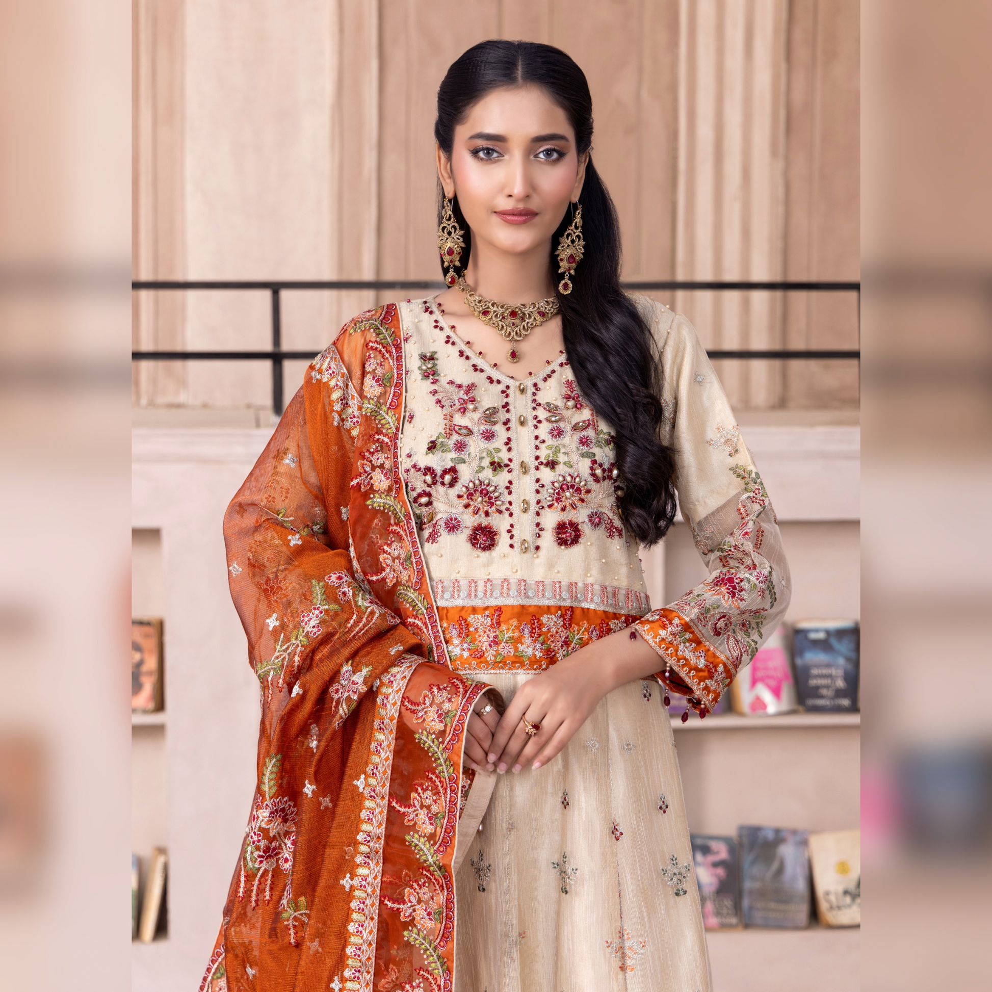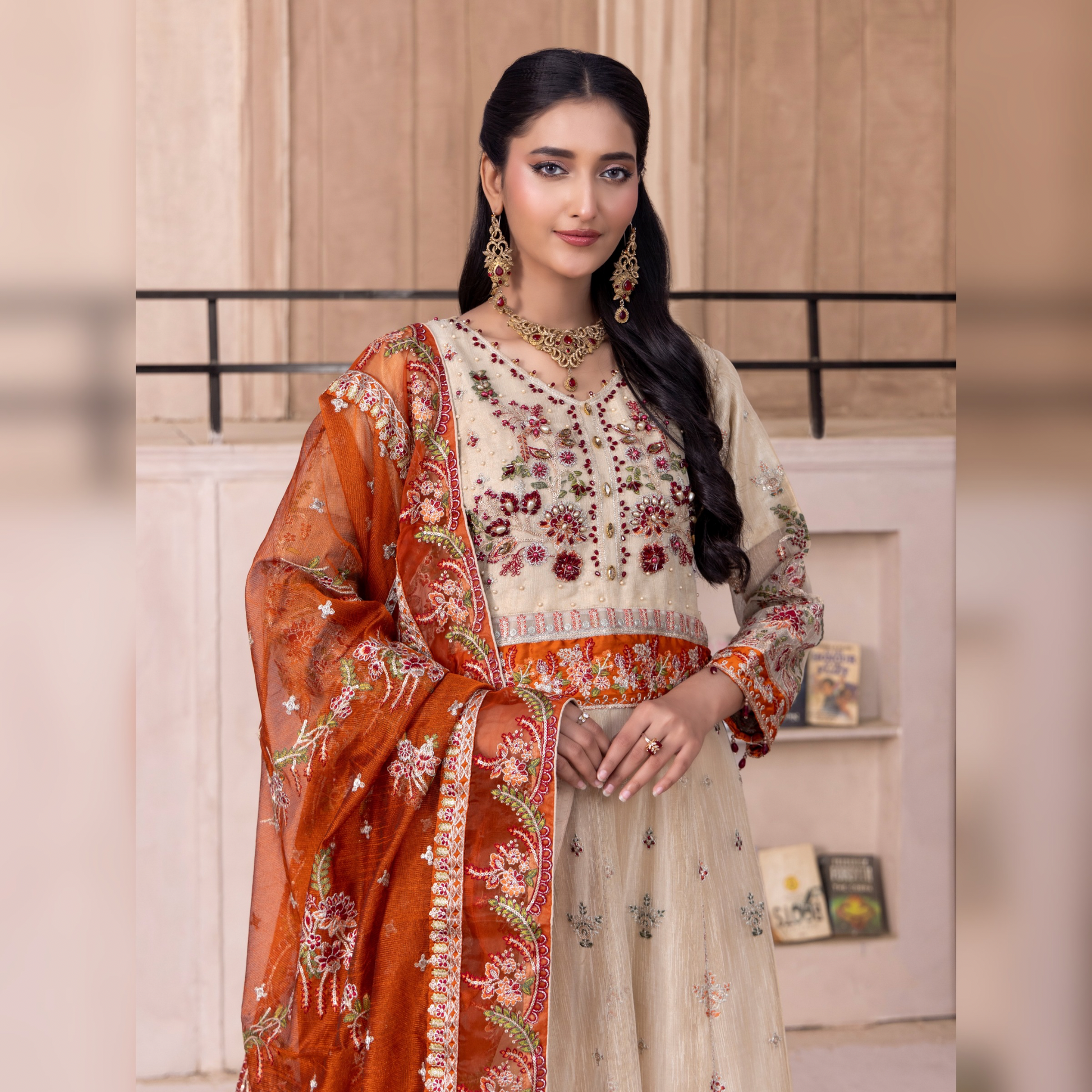 This outfit is a masterpiece of elegance and craftsmanship. The Khadi Net dress is adorned with intricate embroidery across the front and back panels, with additional embellishments on the front body for added glamour. The sleeves also feature detailed embroidery, creating a cohesive look. The outfit includes embroidered patches on silk, enhancing its luxurious feel. The ready-to-wear dupatta made of net completes the ensemble, paired with a shamos silk trouser. The colour palette offers versatility with Beige/Maroon, Beige/Orange and Sea Green/Bottle Green options, allowing for a personalised choice. With its unstitched design, the outfit provides flexibility in tailoring to achieve a perfect fit.ย