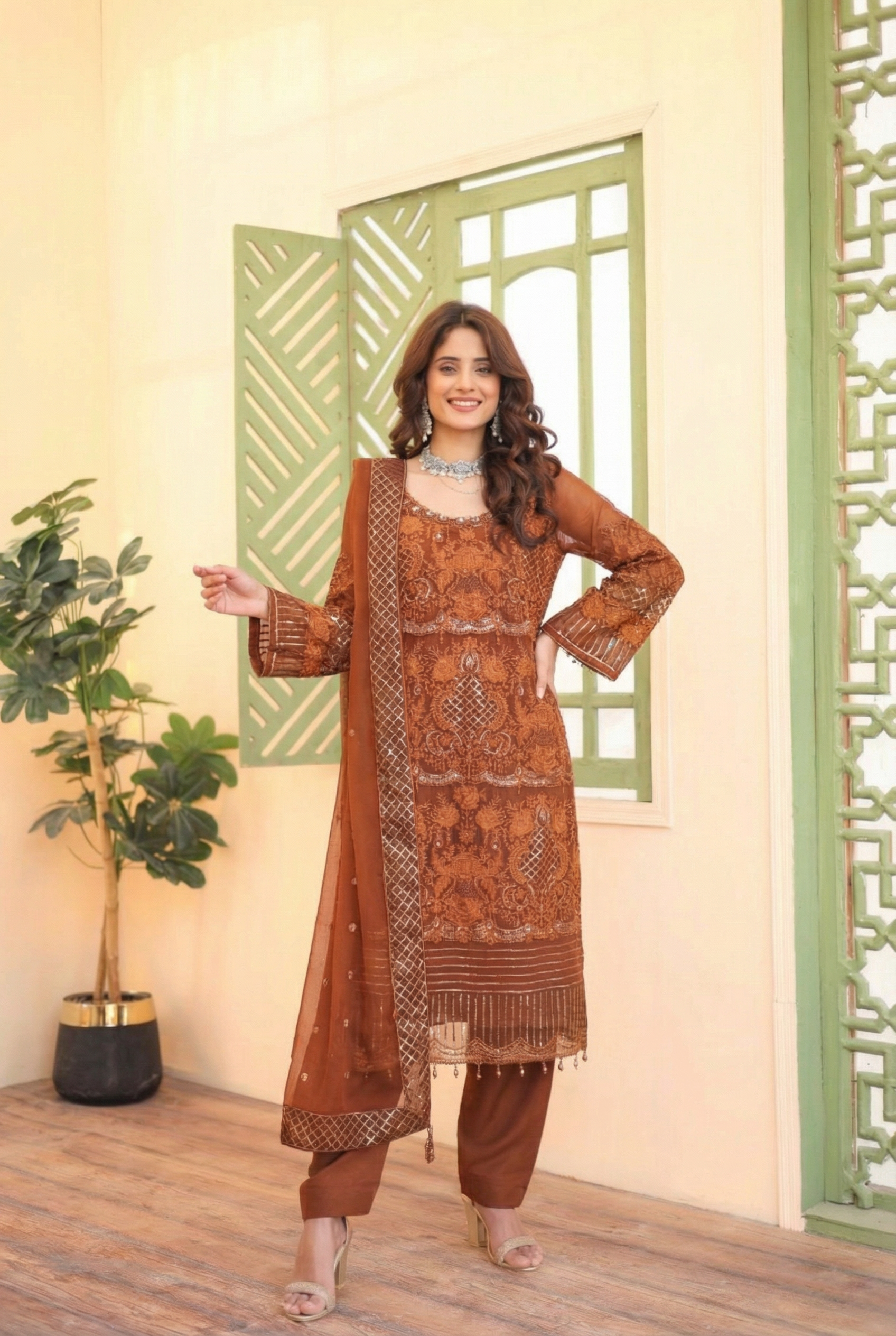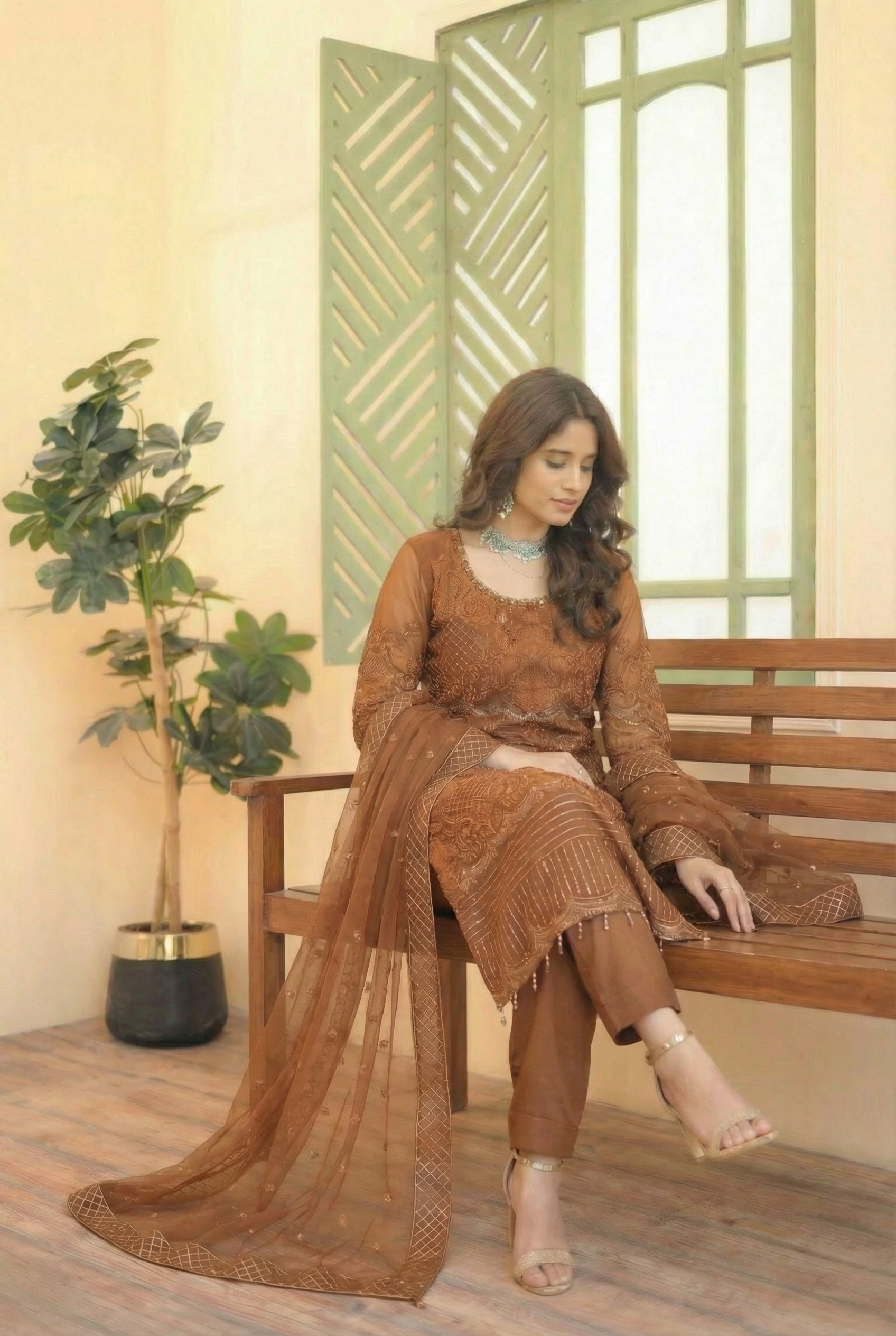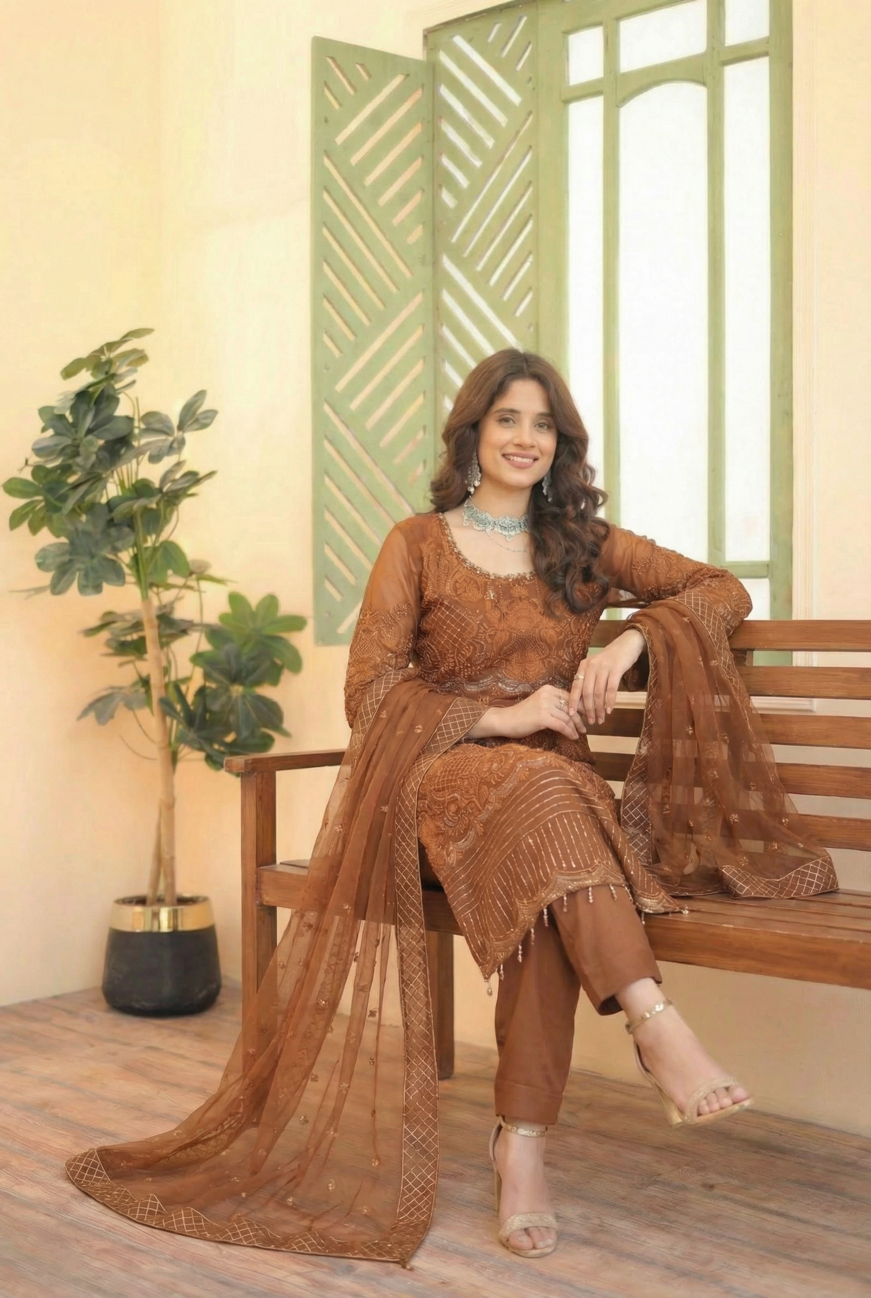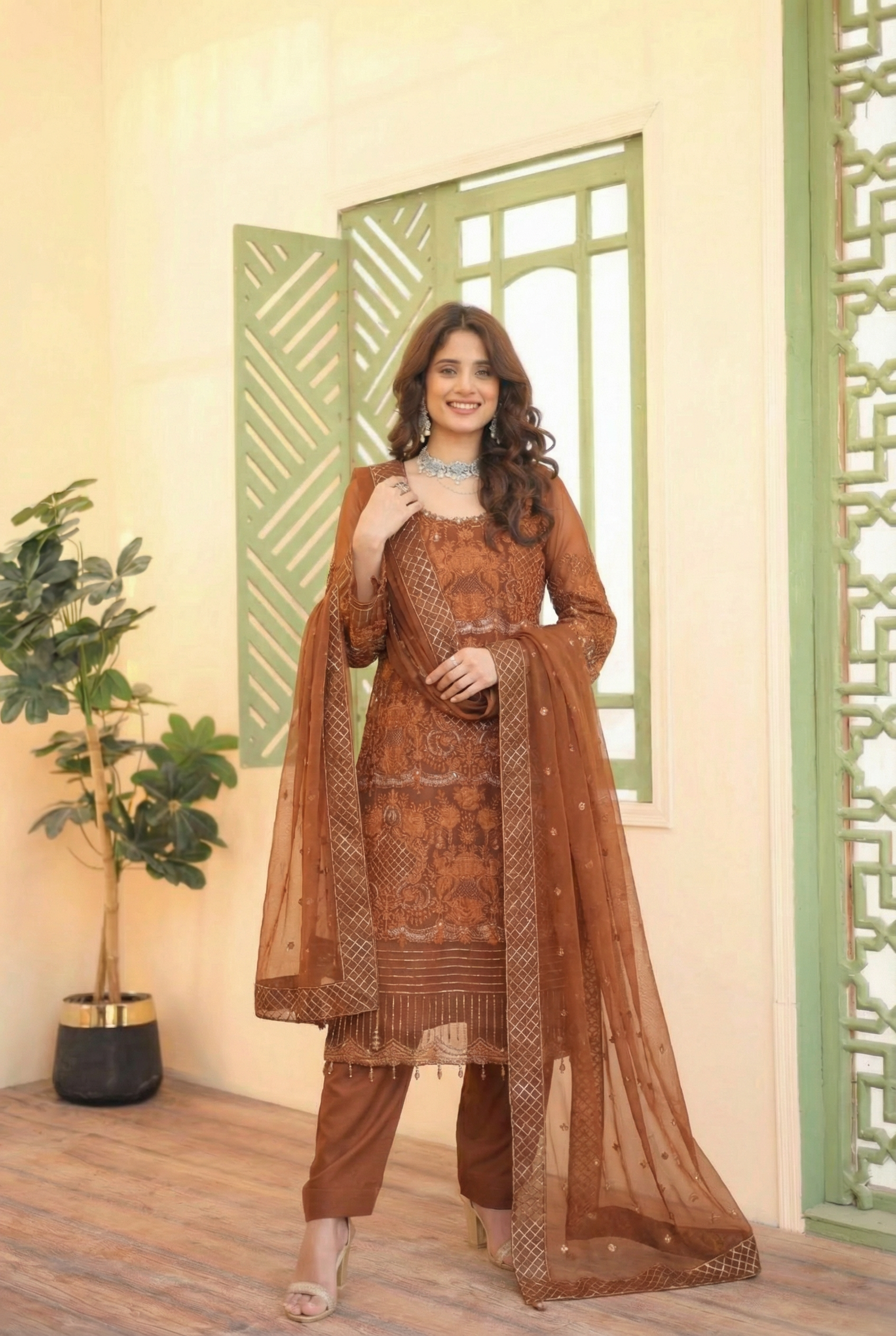 A stunning ensemble that blends elegance with a bold cosmic edge. This unstitched masterpiece features an embroidered chiffon shirt, back, and sleeves, each piece meticulously crafted to offer a rich texture and intricate detail. The Deep Black, Royal Brown, & Navy BlueΒ hues create a striking palette reminiscent of the vast, mysterious universe. The standout feature is the organza neckline patch, complemented by matching organza patches on the front and back, adding a delicate yet powerful dimension to the outfit. The chiffon dupatta, also embroidered, completes the look with a flowing grace that mirrors the weightlessness of space. Perfect for those who dare to explore fashion's final frontier with sophistication and style.Β