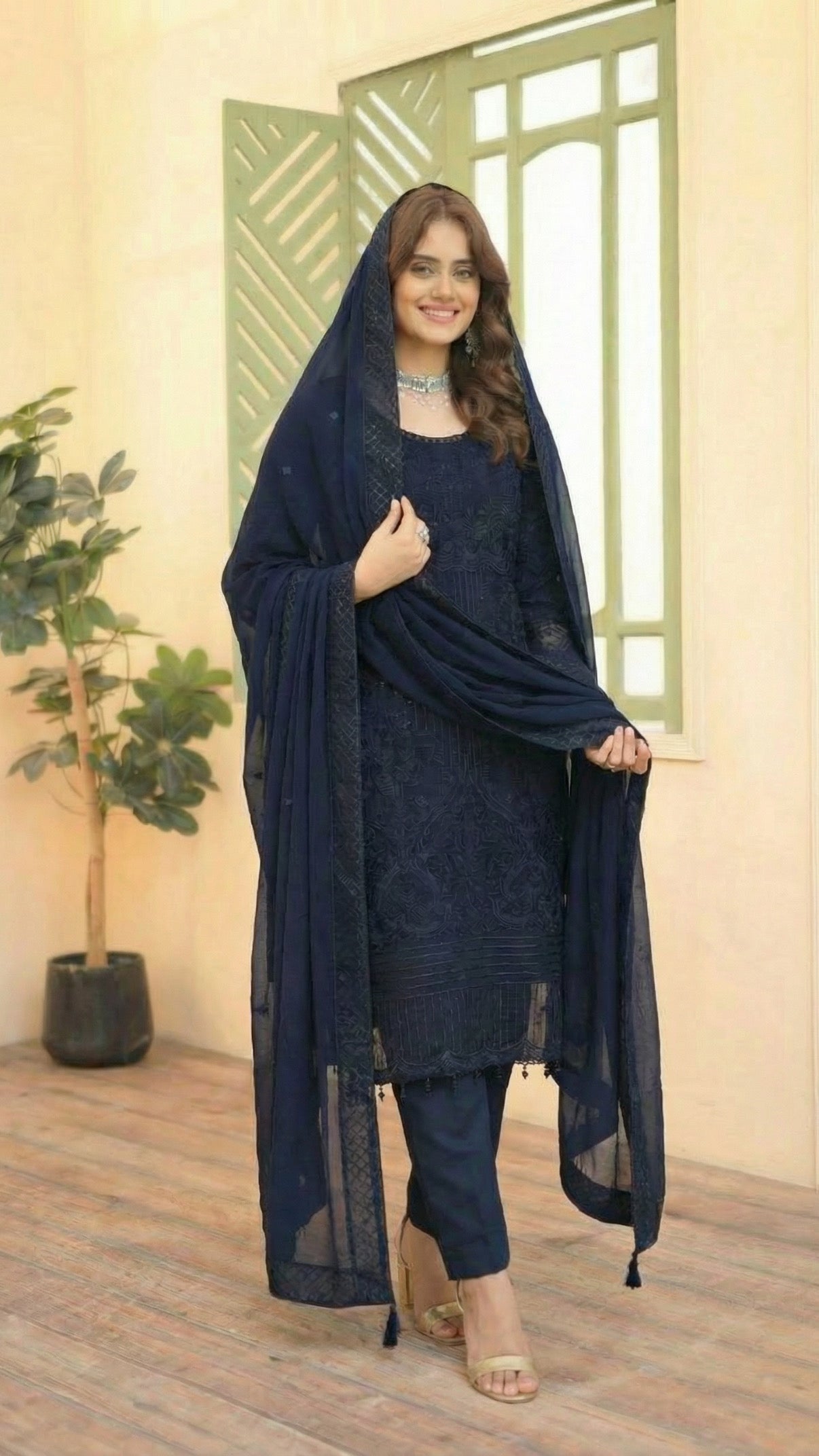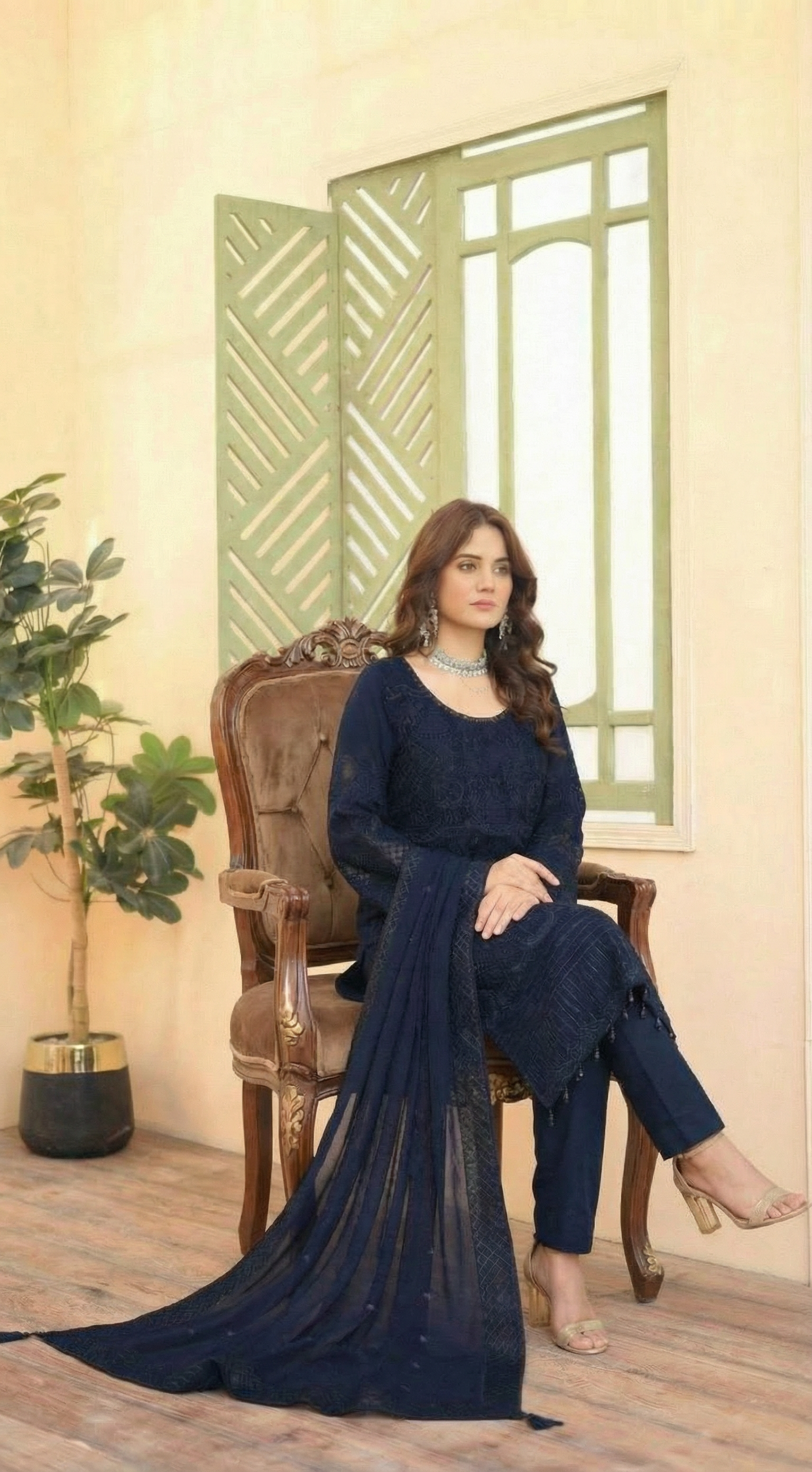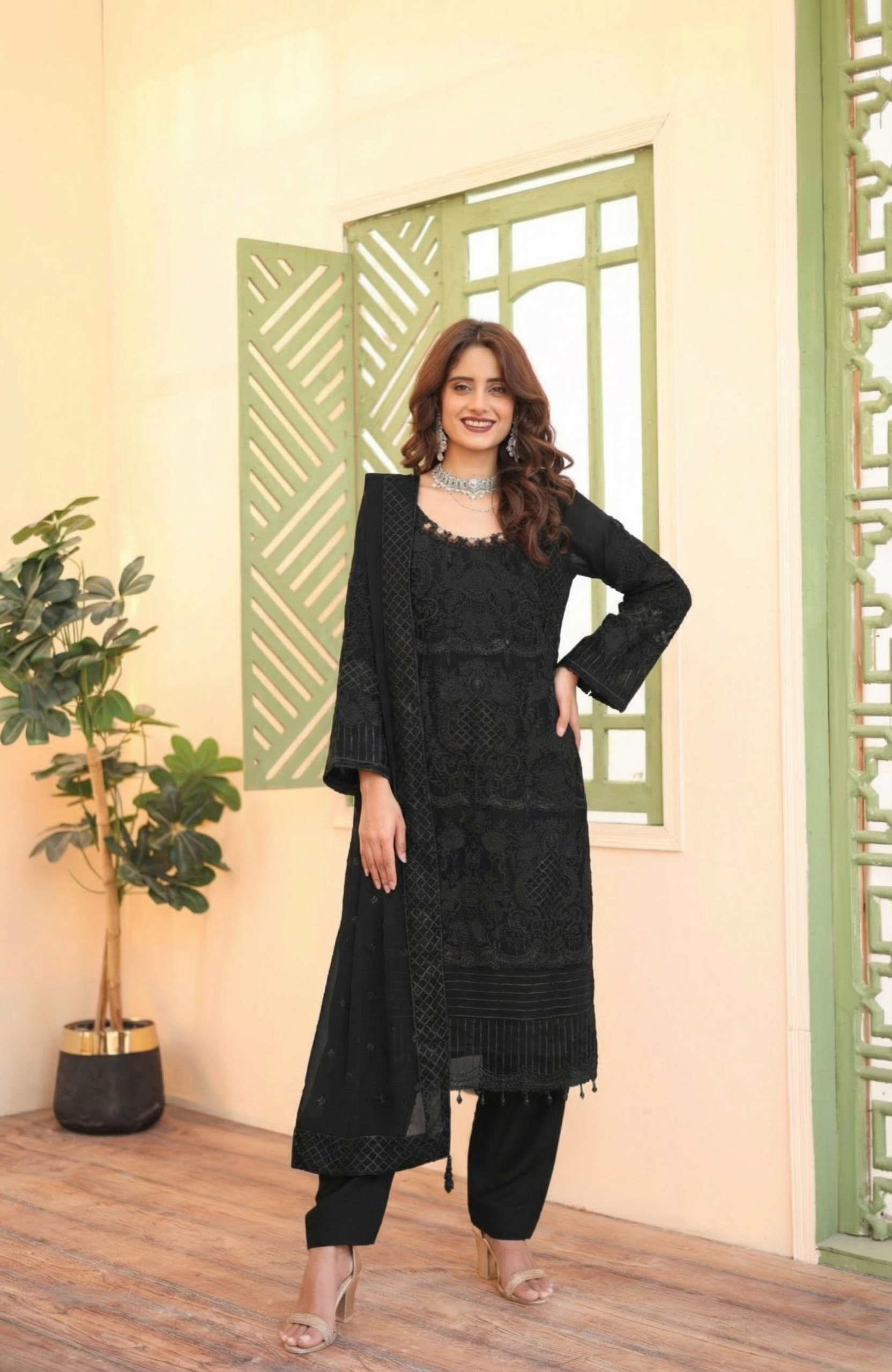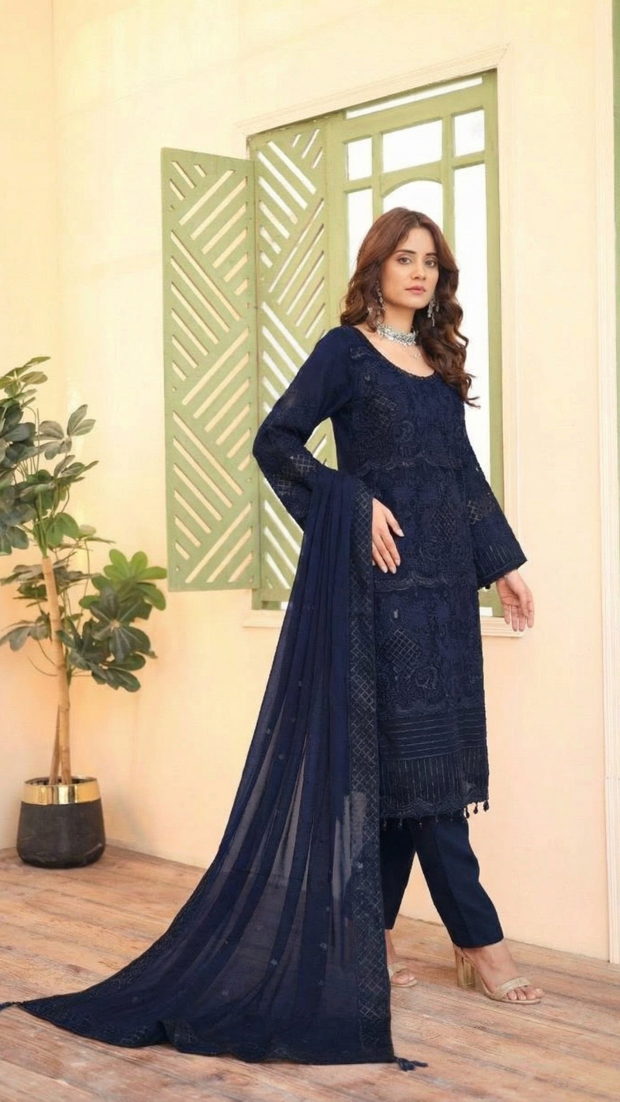 A stunning ensemble that blends elegance with a bold cosmic edge. This unstitched masterpiece features an embroidered chiffon shirt, back, and sleeves, each piece meticulously crafted to offer a rich texture and intricate detail. The Deep Black, Royal Brown, & Navy BlueΒ hues create a striking palette reminiscent of the vast, mysterious universe. The standout feature is the organza neckline patch, complemented by matching organza patches on the front and back, adding a delicate yet powerful dimension to the outfit. The chiffon dupatta, also embroidered, completes the look with a flowing grace that mirrors the weightlessness of space. Perfect for those who dare to explore fashion's final frontier with sophistication and style.Β