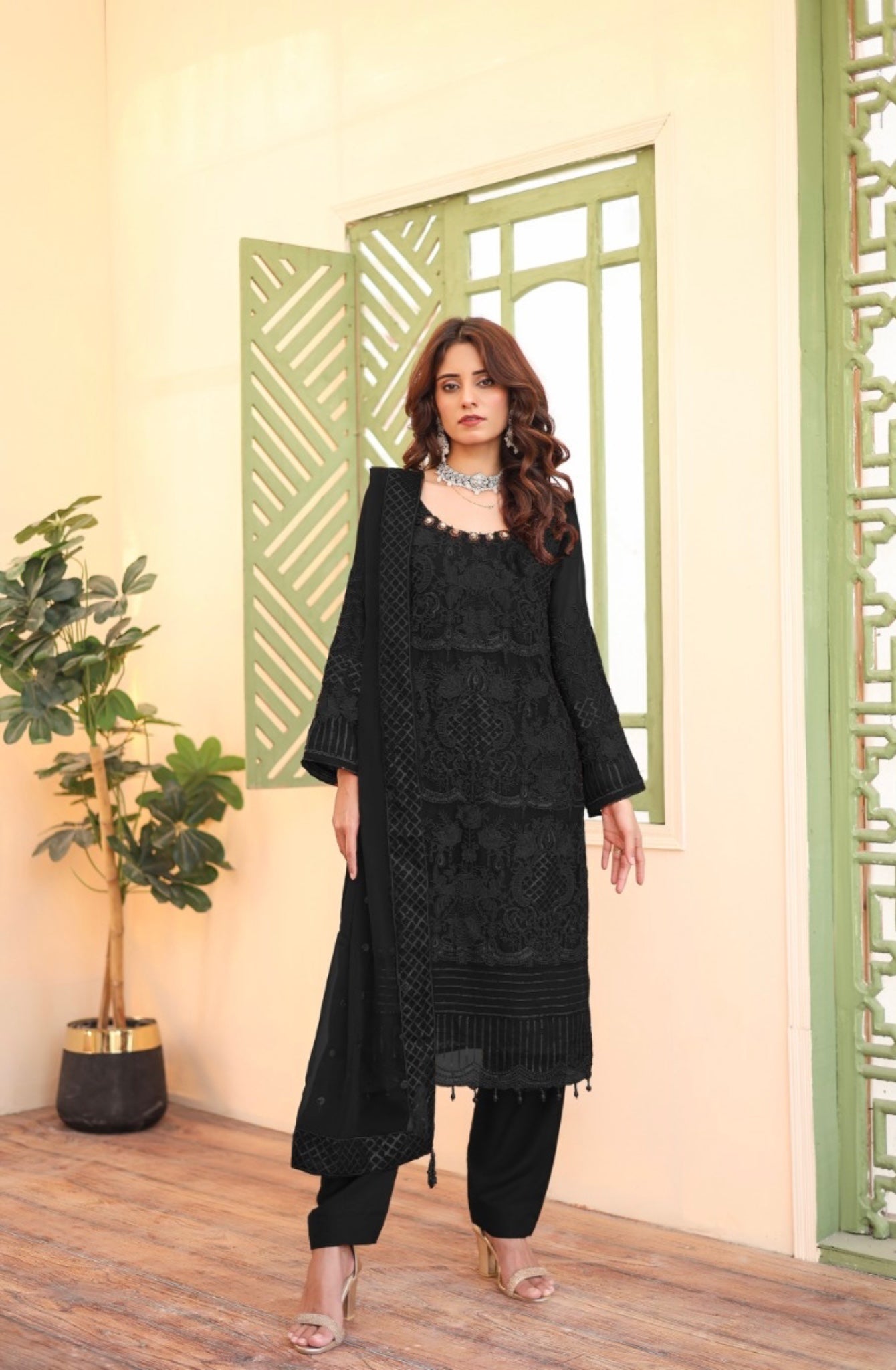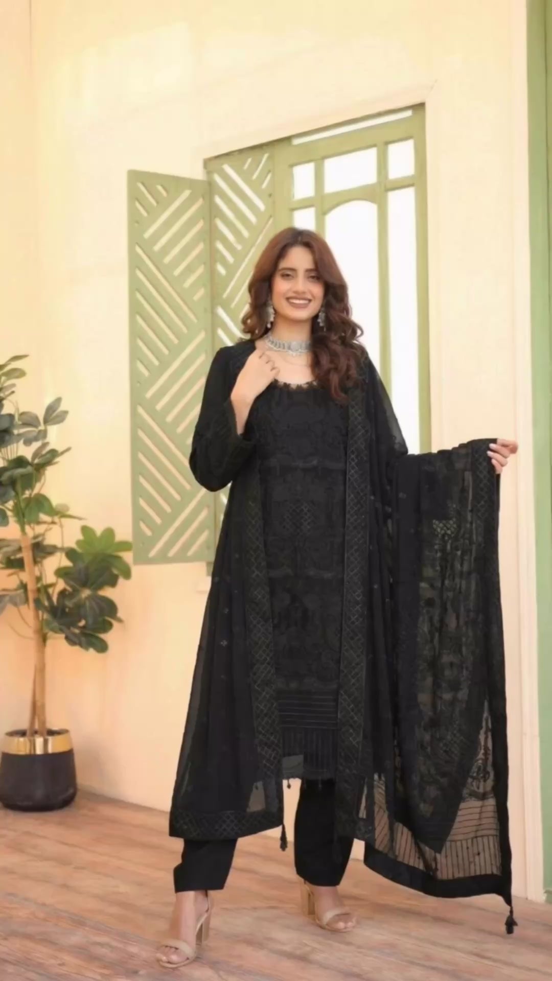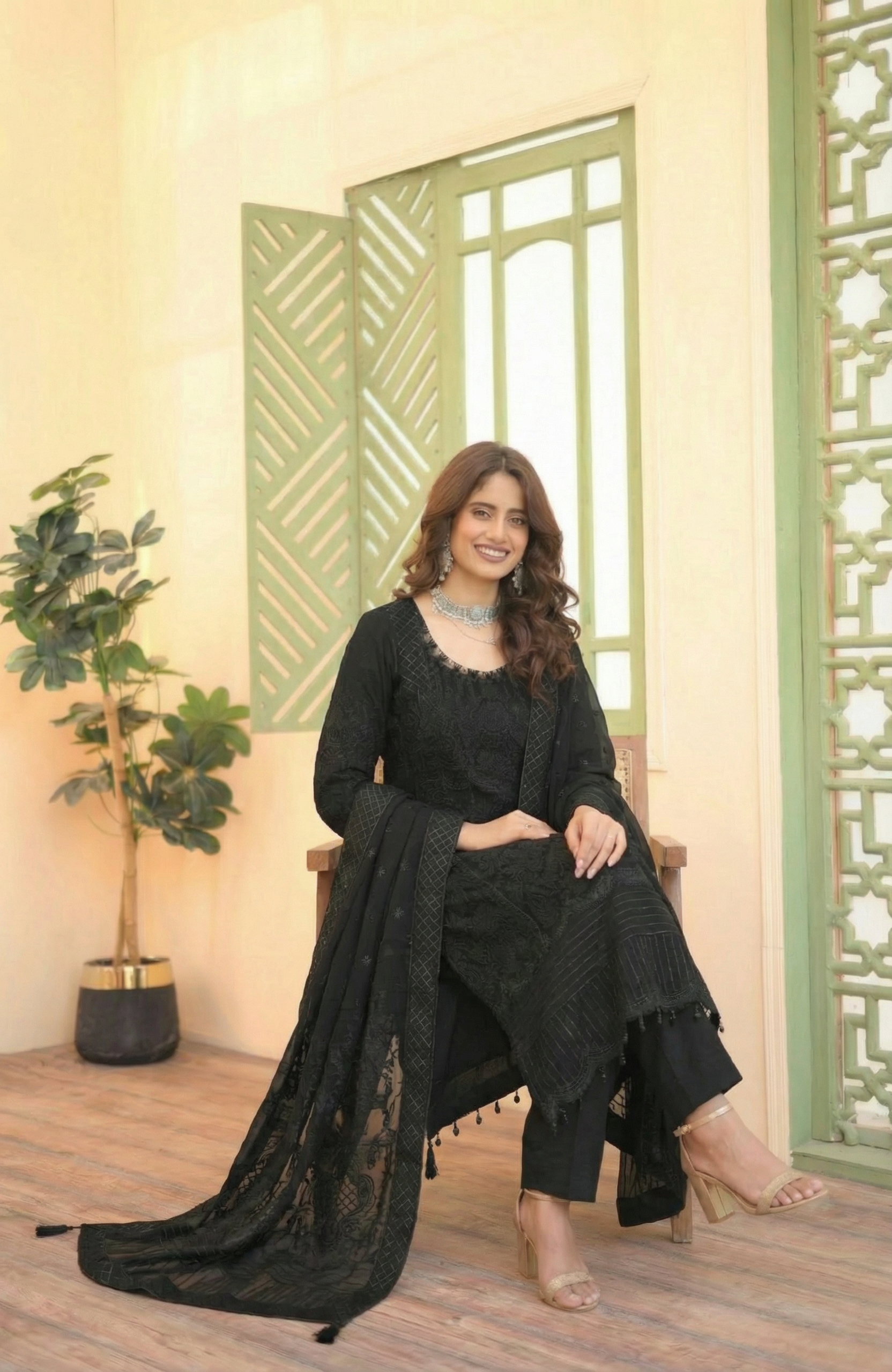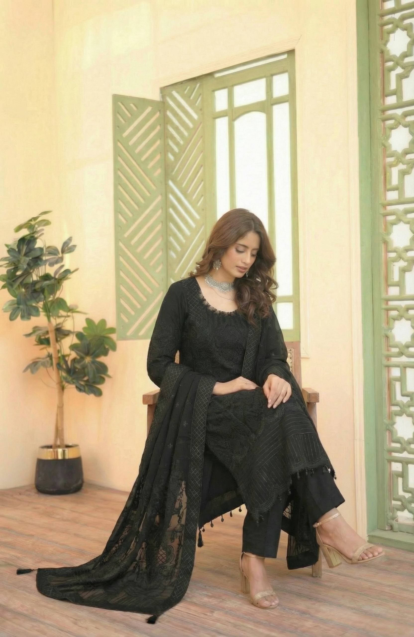 A stunning ensemble that blends elegance with a bold cosmic edge. This unstitched masterpiece features an embroidered chiffon shirt, back, and sleeves, each piece meticulously crafted to offer a rich texture and intricate detail. The Deep Black, Royal Brown, & Navy BlueΒ hues create a striking palette reminiscent of the vast, mysterious universe. The standout feature is the organza neckline patch, complemented by matching organza patches on the front and back, adding a delicate yet powerful dimension to the outfit. The chiffon dupatta, also embroidered, completes the look with a flowing grace that mirrors the weightlessness of space. Perfect for those who dare to explore fashion's final frontier with sophistication and style.Β