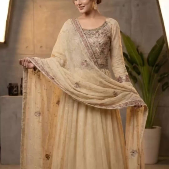 The πππππππ outfit is a celestial masterpiece, meticulously crafted for those who command attention. This unstitched ensemble, presented in a sophisticated Beige hue, begins with a breathtaking embroidered chiffon maxi dress. The front of the maxi is adorned with intricate embroidery, catching the light like distant stars. Following this celestial theme, the back of the dress features complementary embroidery on chiffon, ensuring a stunning profile from every angle. The sleeves are fashioned from embroidered chiffon, detailed with delicate tussles that add a playful yet elegant flair, reminiscent of cosmic trails. Completing the ethereal vision is a matching embroidered chiffon dupatta, also embellished with charming tussles, which drapes with graceful fluidity. To ground this cosmic creation, the outfit includes plain Indian raw silk trousers, offering a luxurious texture and a smooth contrast to the delicate chiffon.