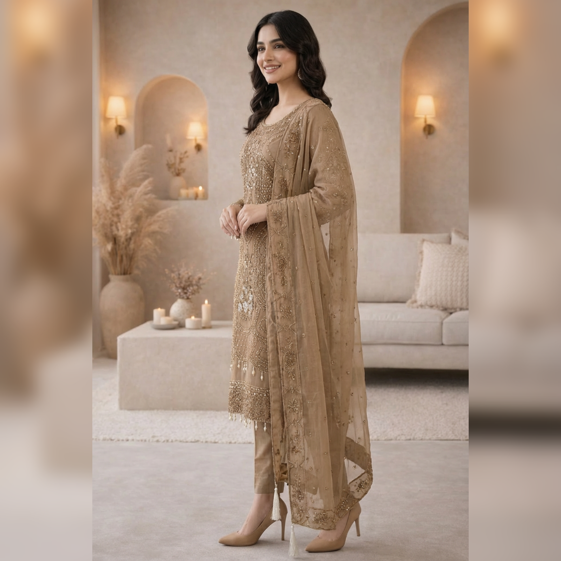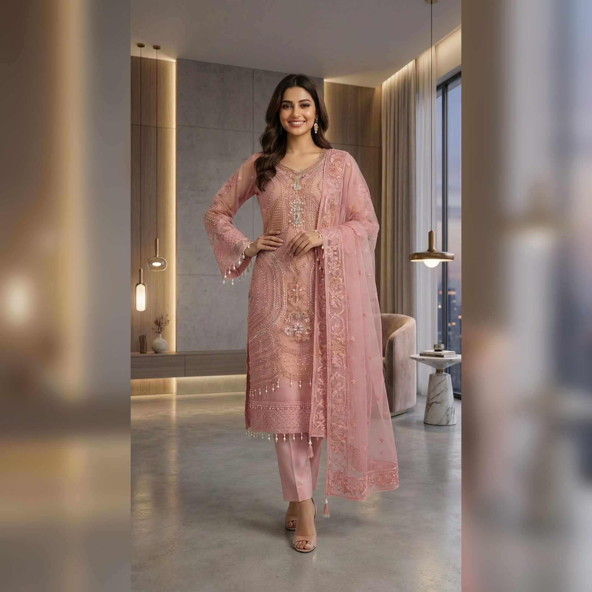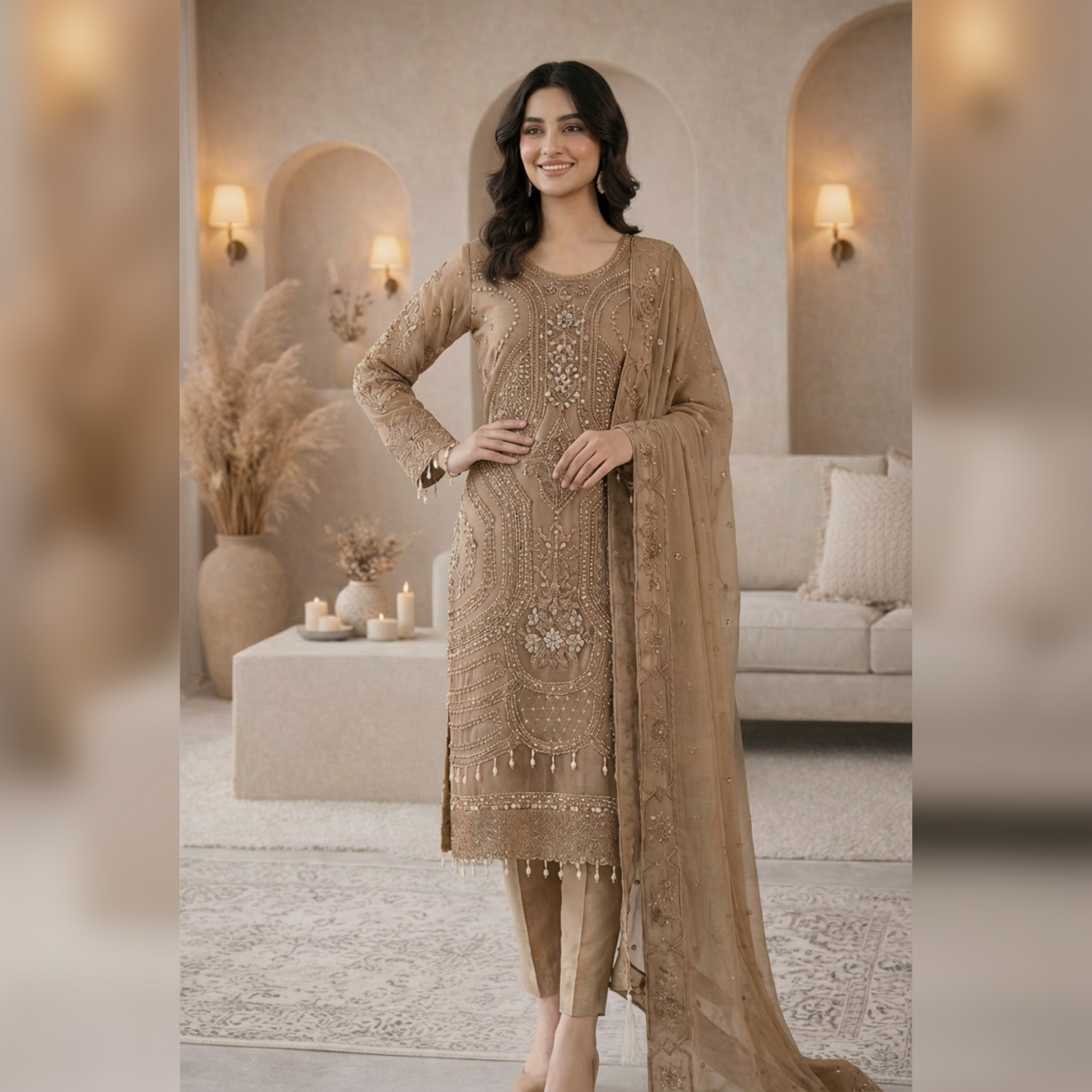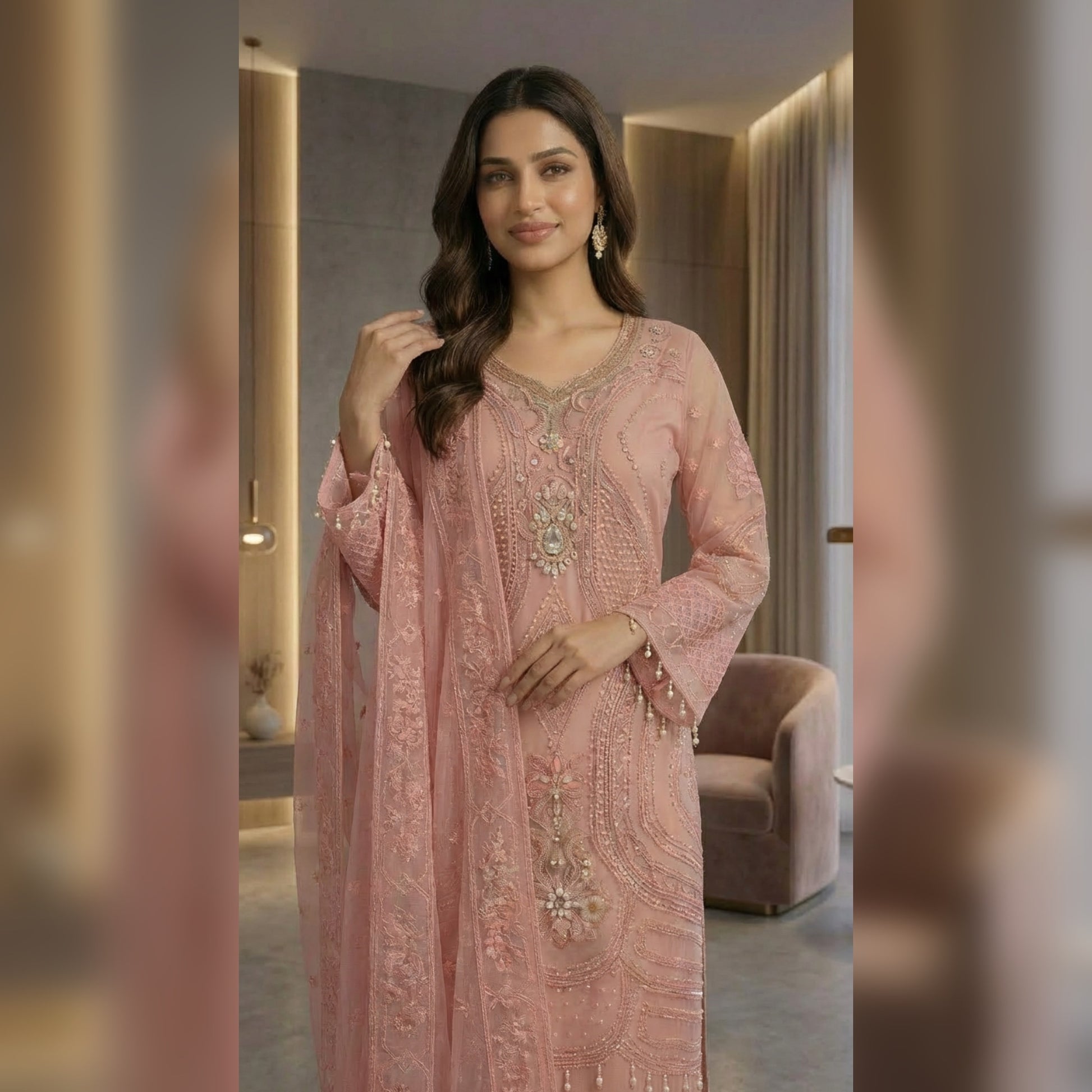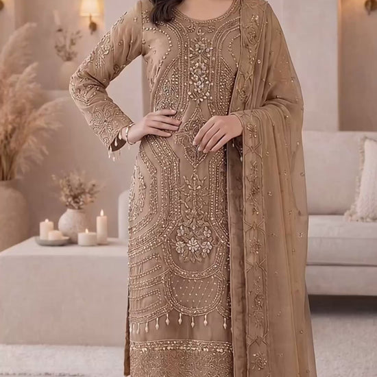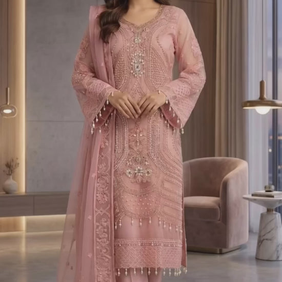 A vision of timeless elegance,ย ๐๐๐๐๐๐๐ย is crafted for those who adore grace with a touch of luxury. This exquisite unstitch ensemble showcases delicate artistry, where every detail reflects refined craftsmanship and classic beauty. The sheer organza shirt is beautifully hand embellished, radiating sophistication, while the flowing chiffon dupatta adds an ethereal charm. Paired with a rich silk trouser, this outfit creates a perfect balance of softness and regal allure. Drenched in the dreamy hues of Blush Pinkย and Light Beige, ๐๐๐๐๐๐๐ย is ideal for festive gatherings, formal occasions, and celebrations where you want to shine effortlessly.