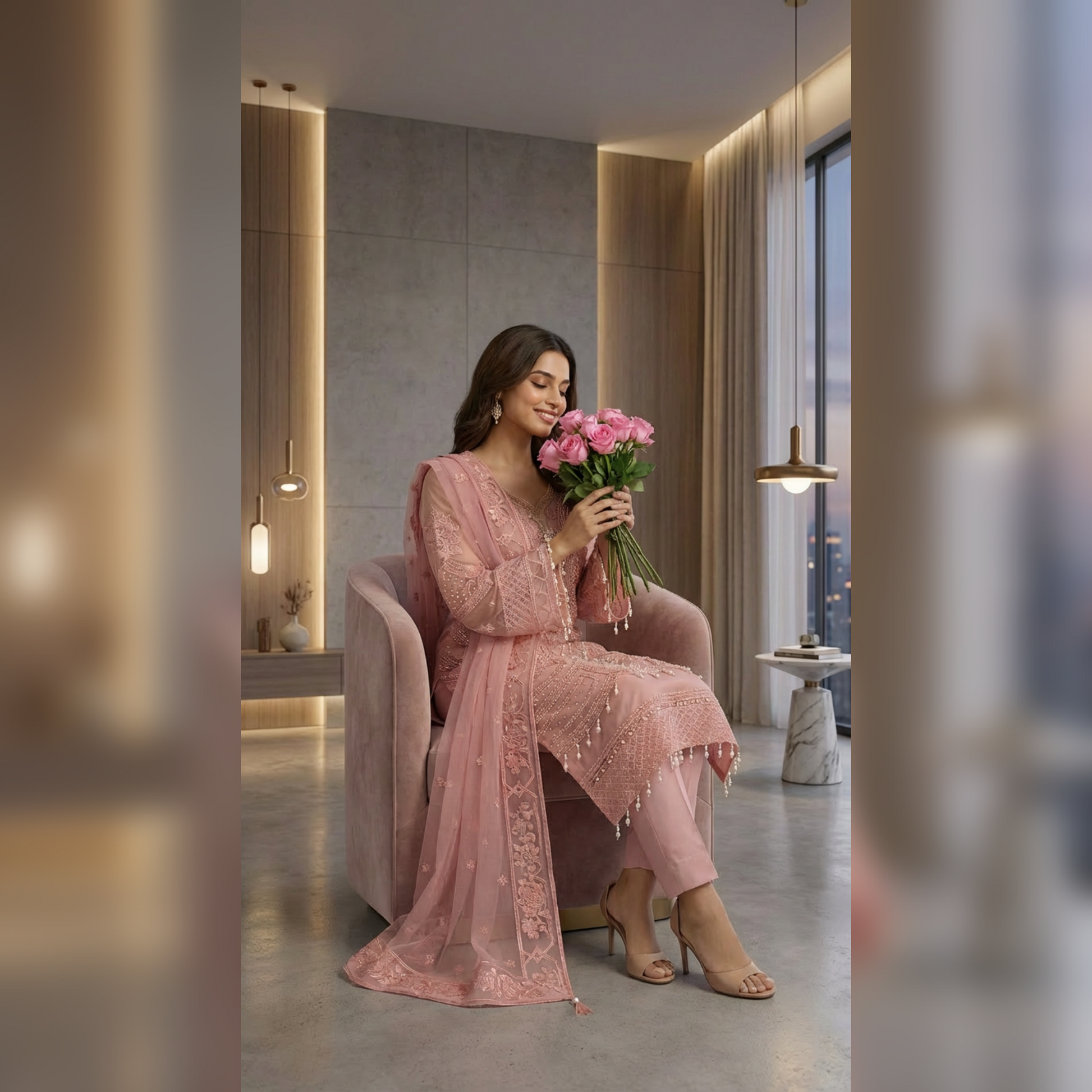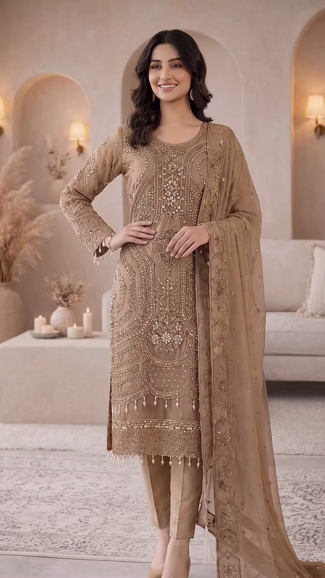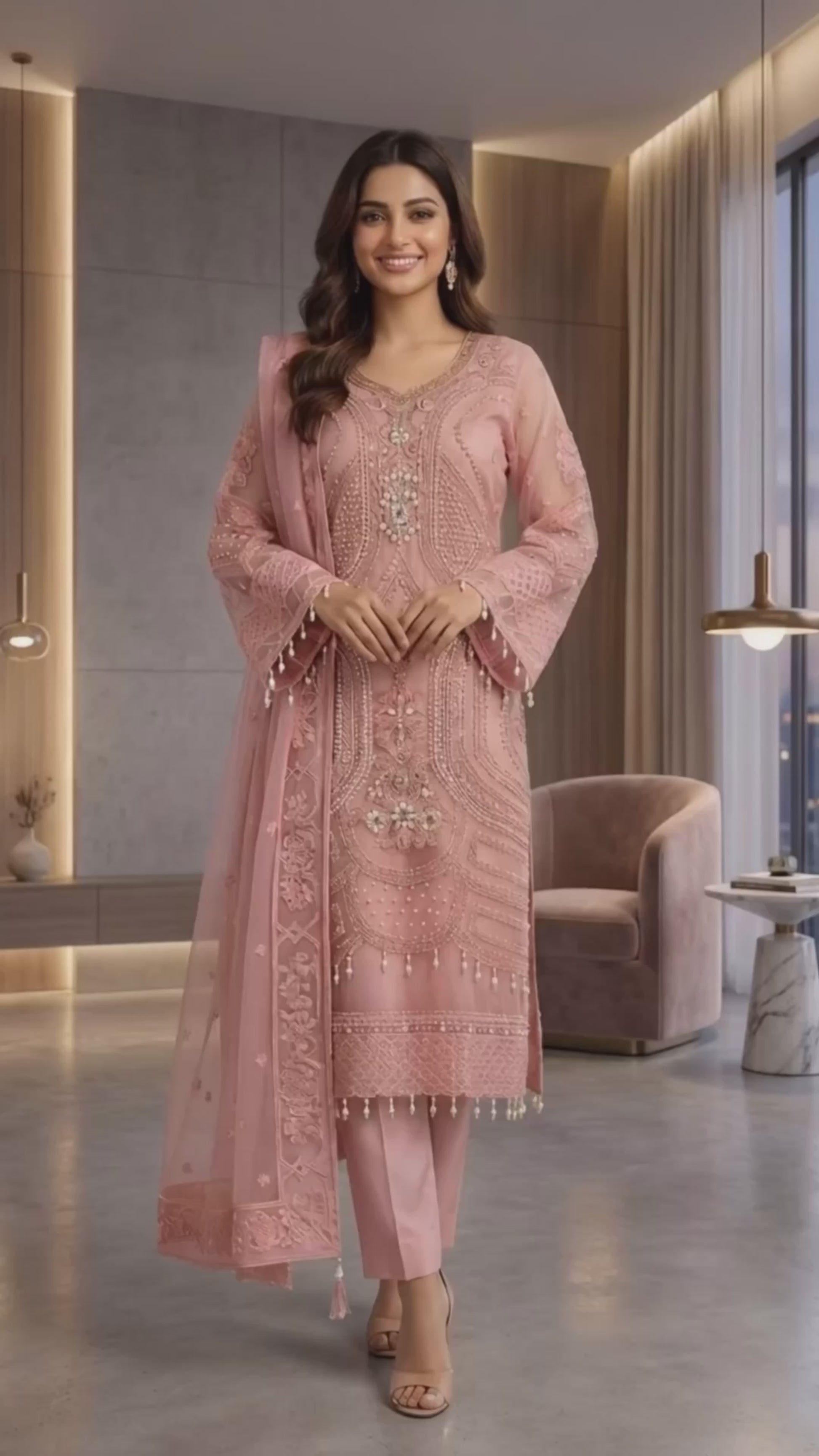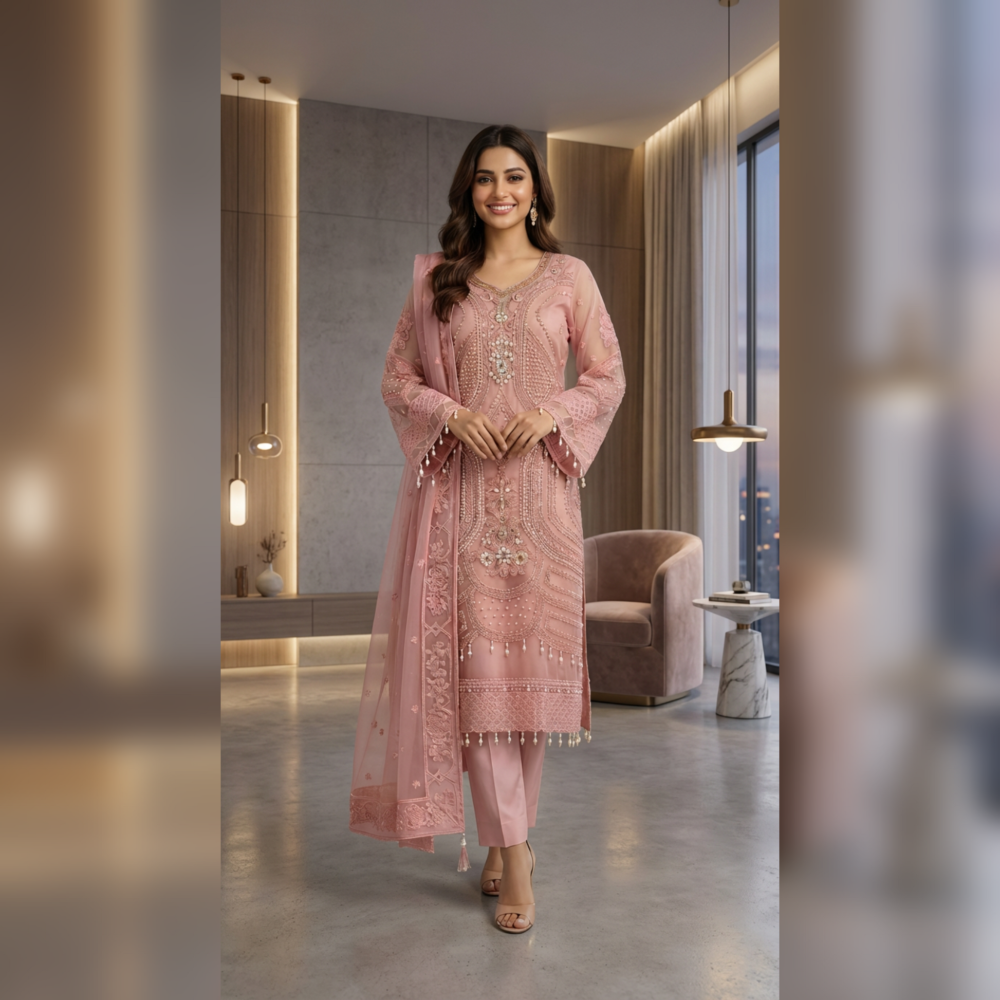 A vision of timeless elegance,ย ๐๐๐๐๐๐๐ย is crafted for those who adore grace with a touch of luxury. This exquisite unstitch ensemble showcases delicate artistry, where every detail reflects refined craftsmanship and classic beauty. The sheer organza shirt is beautifully hand embellished, radiating sophistication, while the flowing chiffon dupatta adds an ethereal charm. Paired with a rich silk trouser, this outfit creates a perfect balance of softness and regal allure. Drenched in the dreamy hues of Blush Pinkย and Light Beige, ๐๐๐๐๐๐๐ย is ideal for festive gatherings, formal occasions, and celebrations where you want to shine effortlessly.