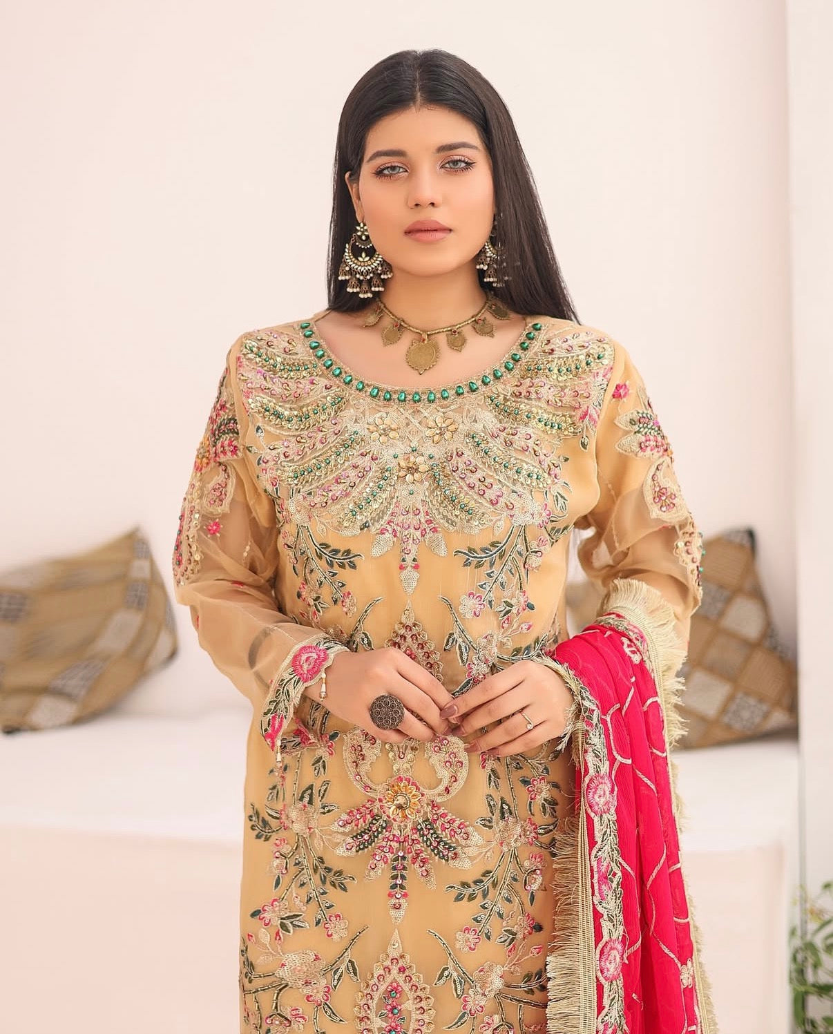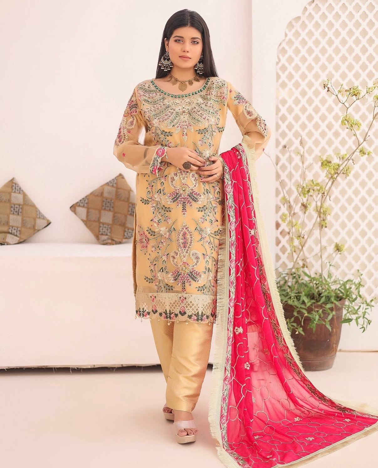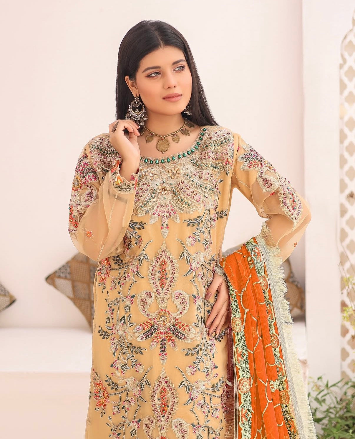 𝐌𝐈𝐒𝐀𝐀𝐋 features a luxurious organza shirt adorned with intricate hand embellishments, creating a beautifully detailed and ornate design. The shirt showcases a soft golden hue with vibrant floral patterns, complemented by delicate handwork. The embellishments, carefully placed across the bodice and sleeves, add a touch of sophistication and glamour. Paired with the shirt is a matching set of jamawar banarsi trousers. The ensemble is completed with a striking chiffon dupatta in a bold Orange, embellished with golden embroidery along the borders, and 4-side lace work on it.