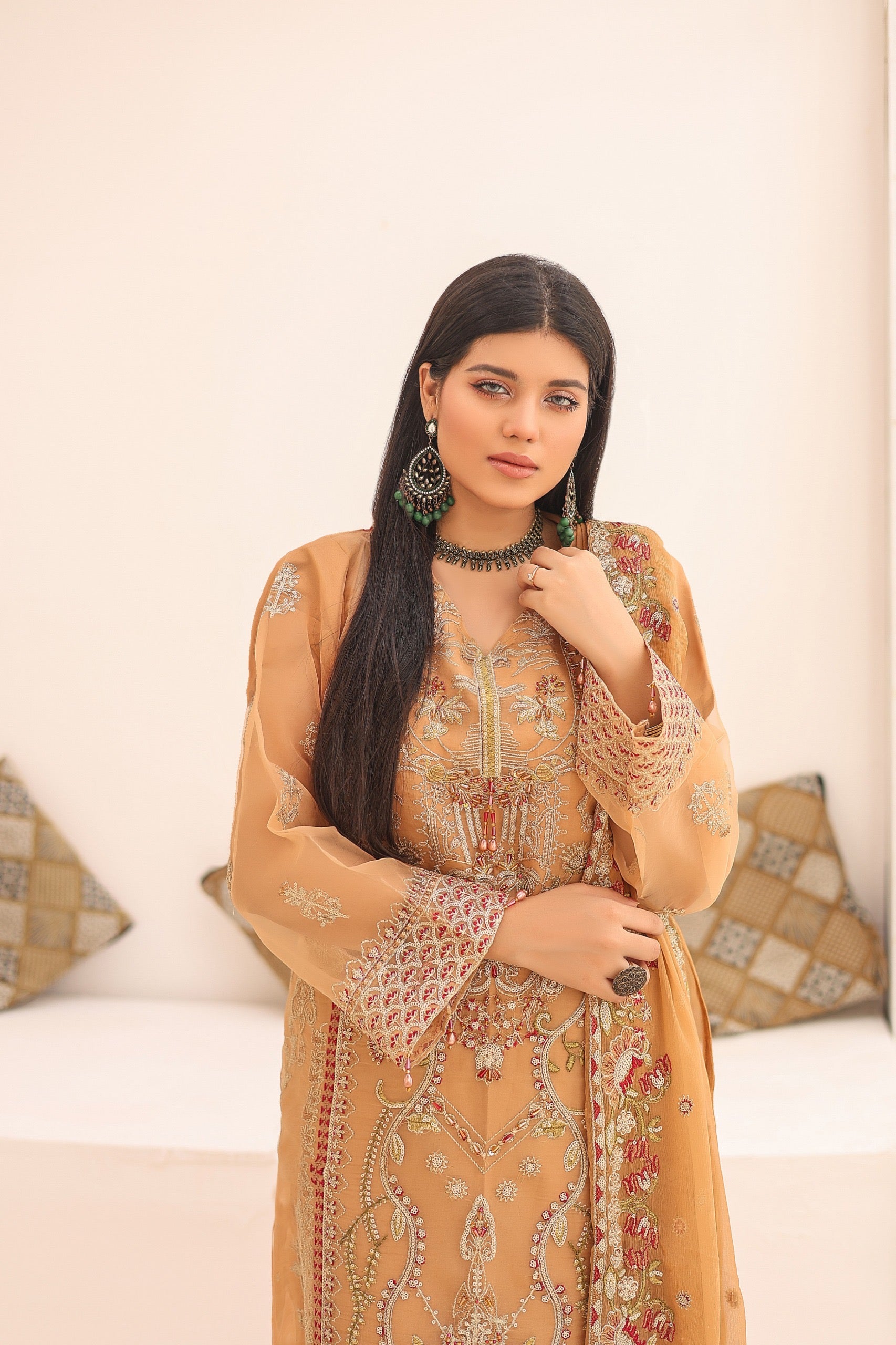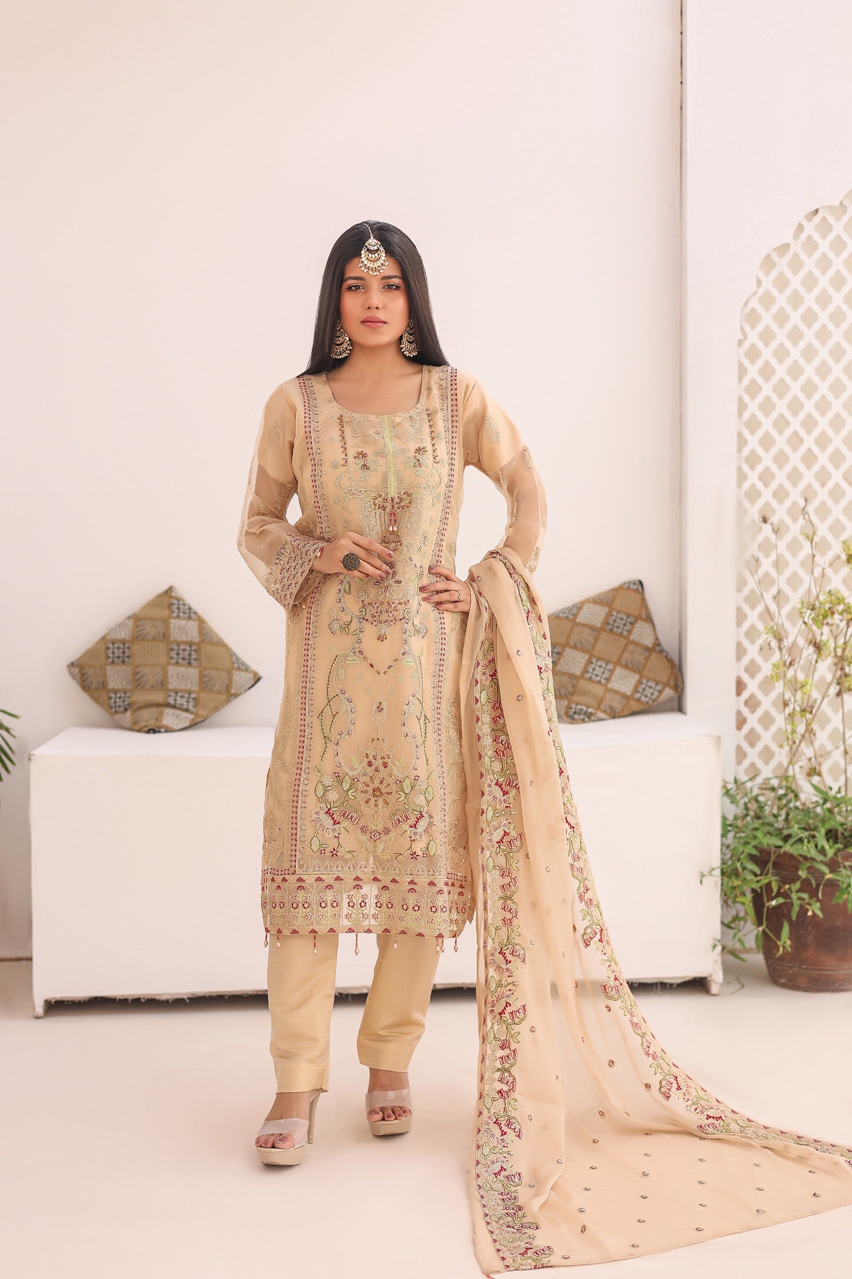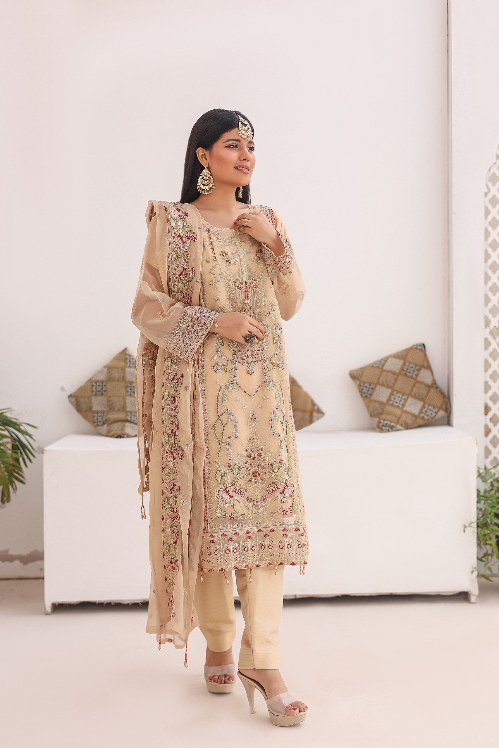 This stunning outfit ππππππ on Beige & Brown shade features a luxurious organza fabric that exudes elegance and sophistication. The intricate embroidery & hand embellishments on the kameez adds a touch of traditional charm, while the matching chiffon dupatta complements the ensemble with its delicate and airy feel. The overall design is perfect for festive occasions or special events, blending classic elements with modern style.