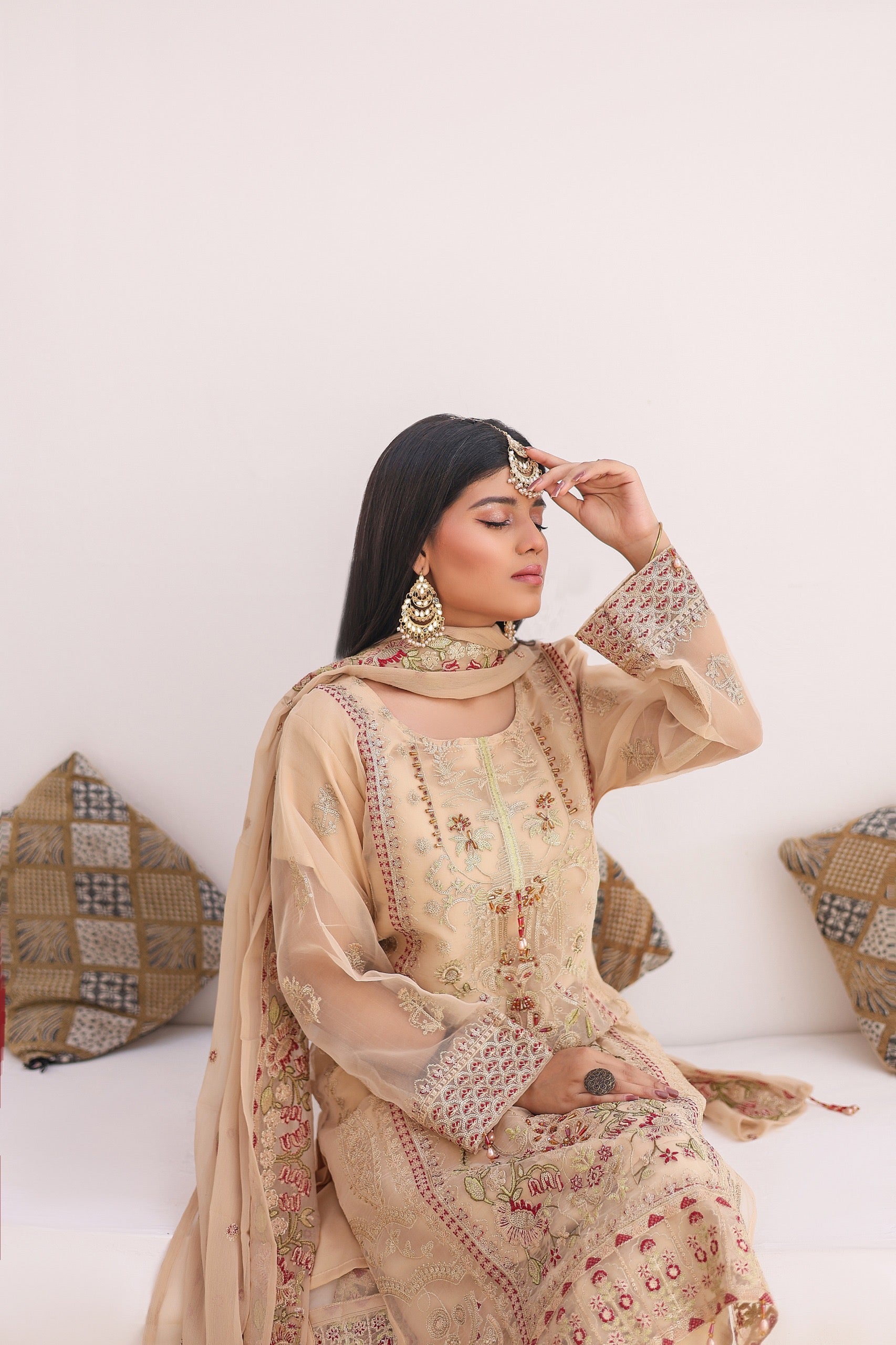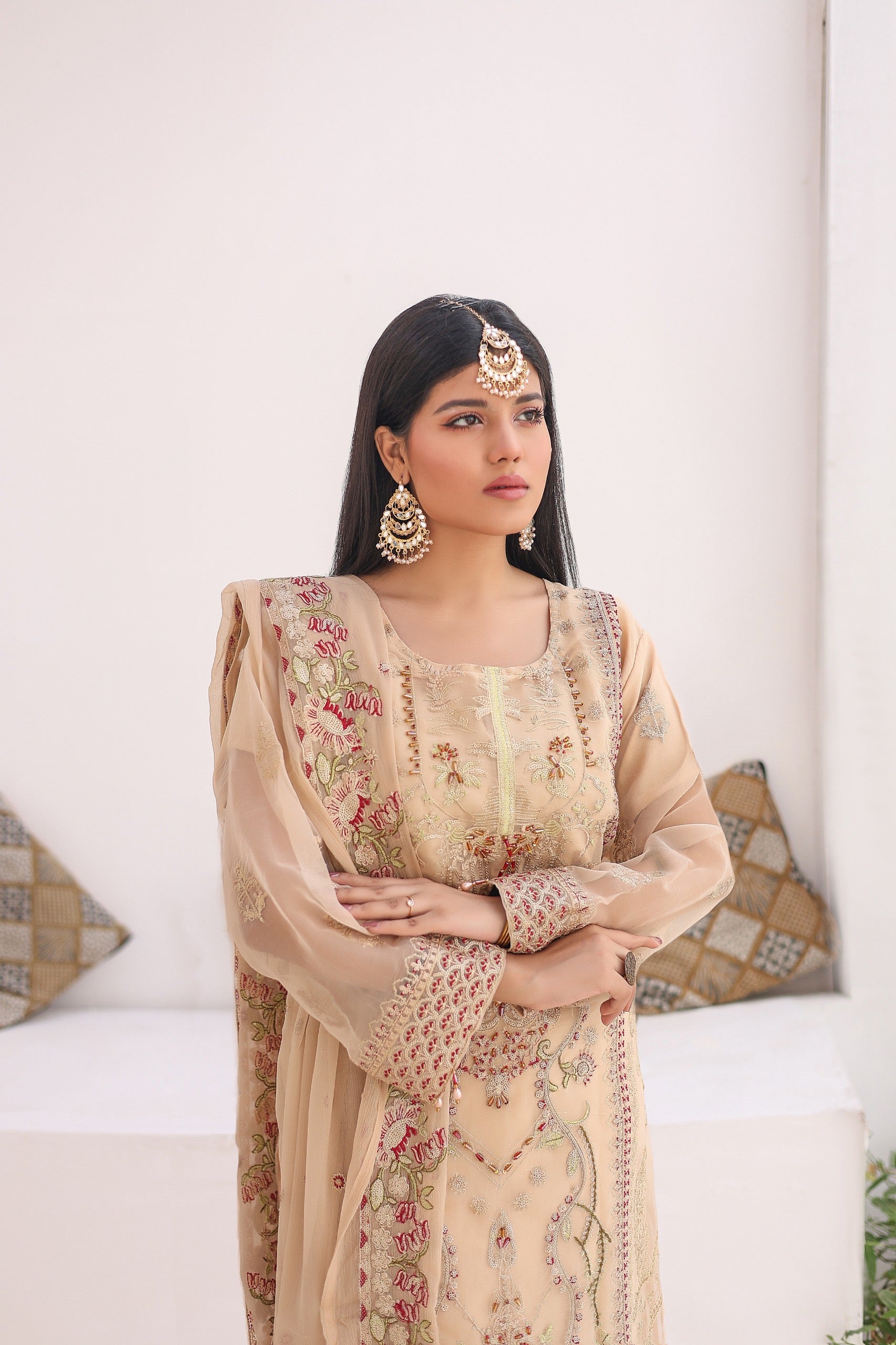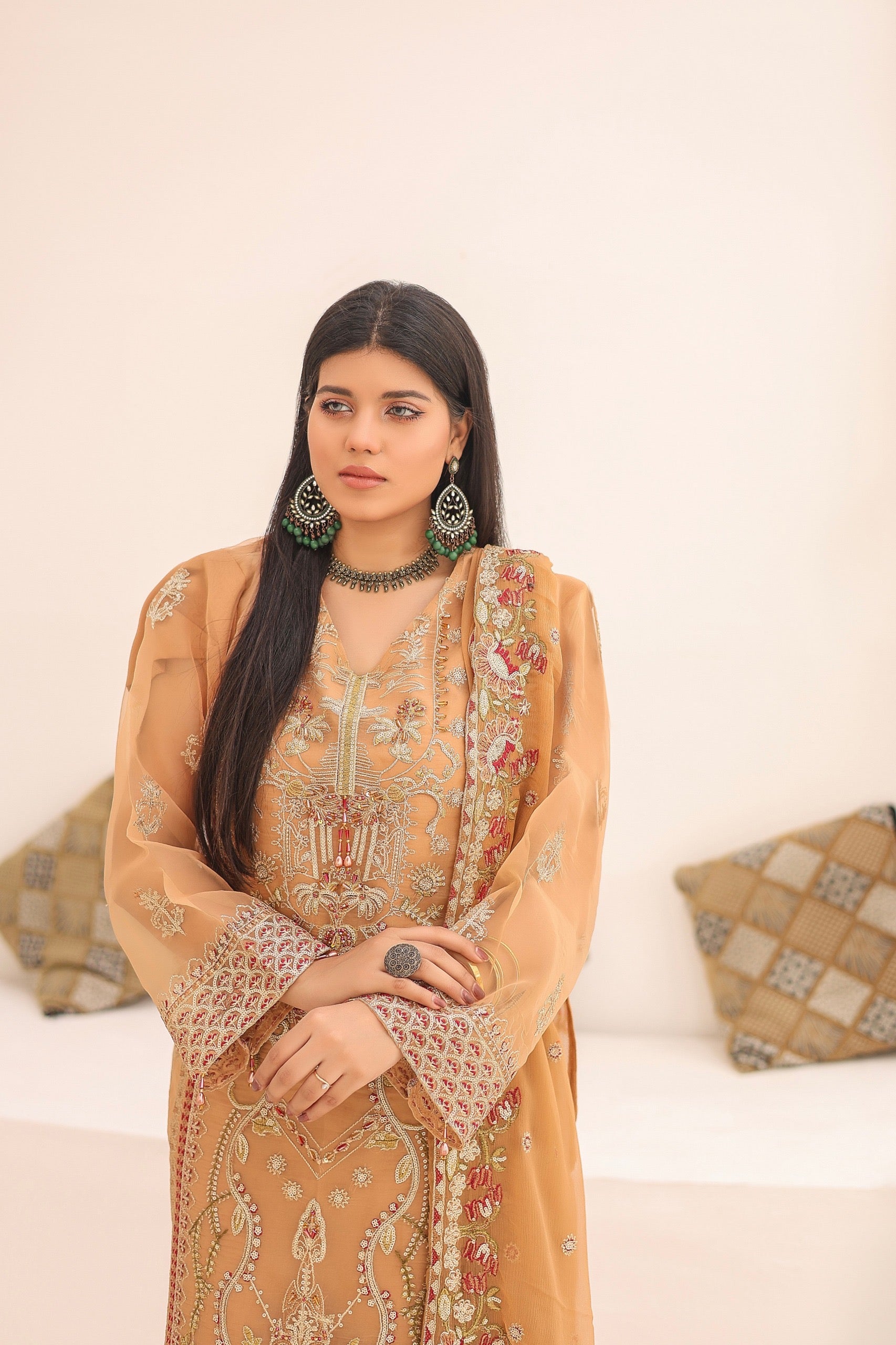 This stunning outfit ππππππ on Beige & Brown shade features a luxurious organza fabric that exudes elegance and sophistication. The intricate embroidery & hand embellishments on the kameez adds a touch of traditional charm, while the matching chiffon dupatta complements the ensemble with its delicate and airy feel. The overall design is perfect for festive occasions or special events, blending classic elements with modern style.